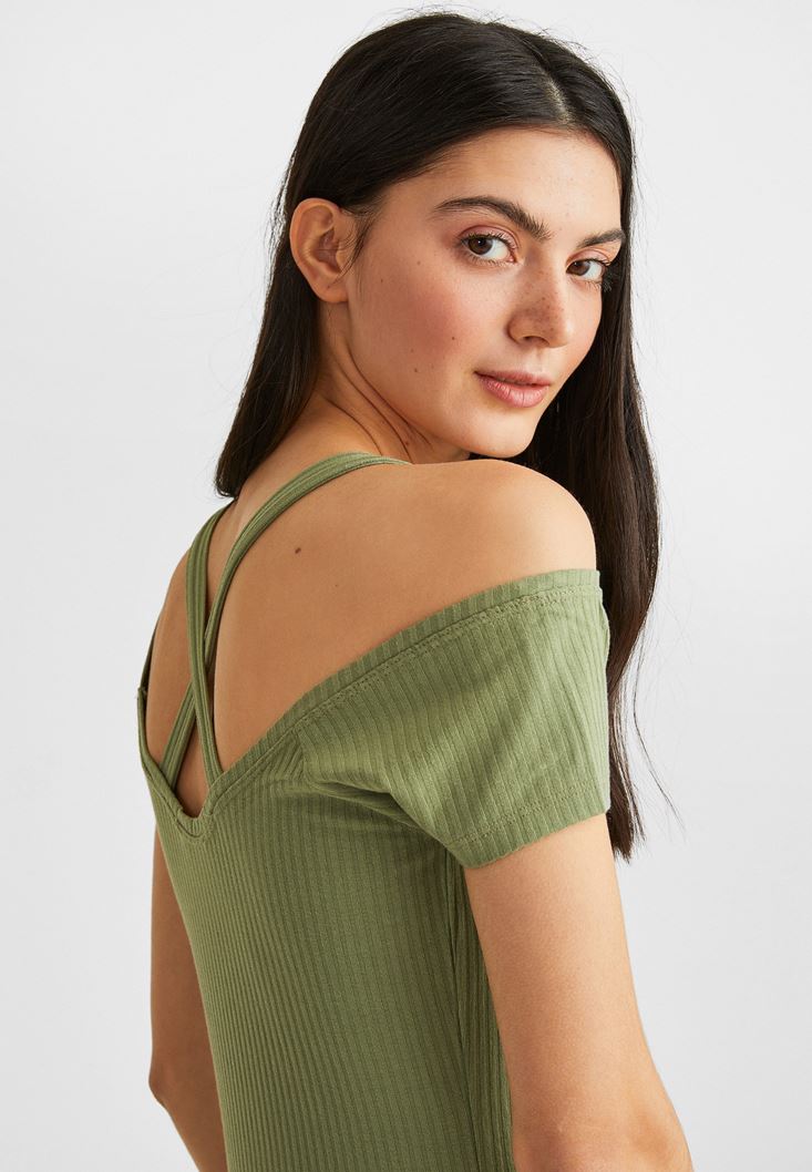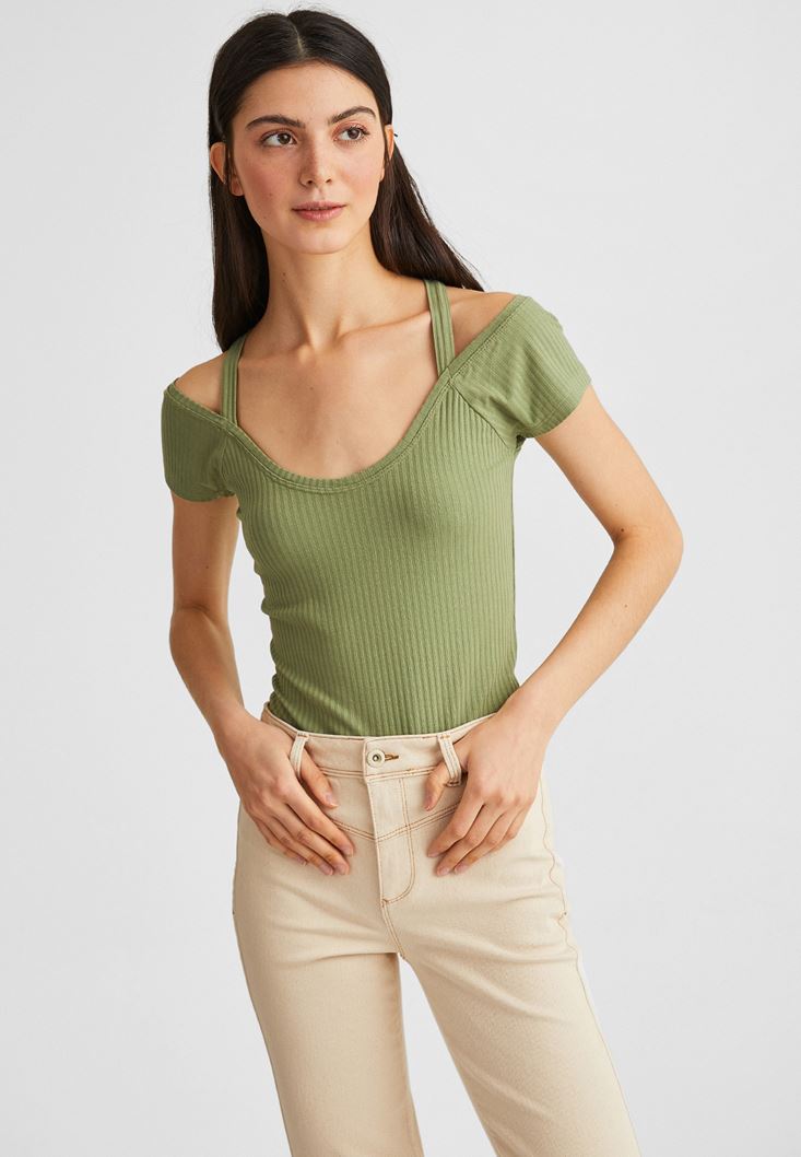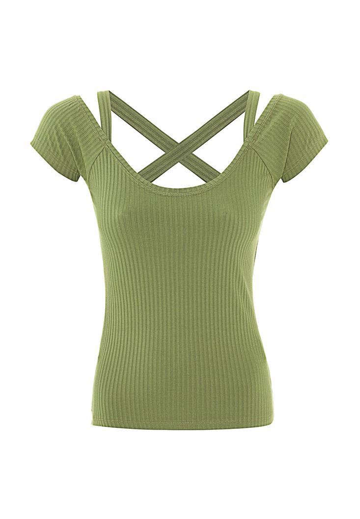 • Bayan Yeşil Sırtı Biye Detaylı Tişört