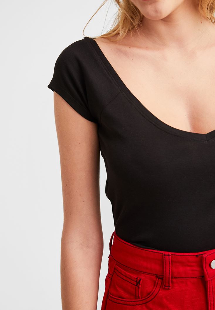 • Bayan Siyah Sırtı Biye Detaylı V Yaka Tişört