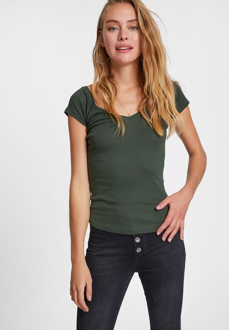 • Bayan Yeşil Sırtı Biye Detaylı V Yaka Tişört