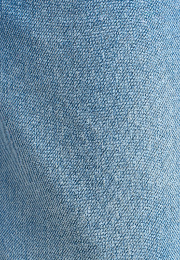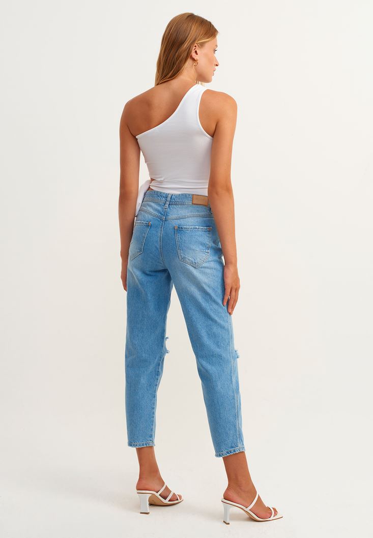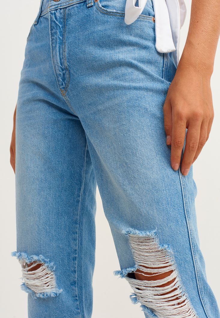 %100 pamuklu denim doku, orta bel, diz kısmı cut-out detaylı, slim paça, boyfriend-fit, bilekte biten paça boyu, önü ve arkası iki cepli.
