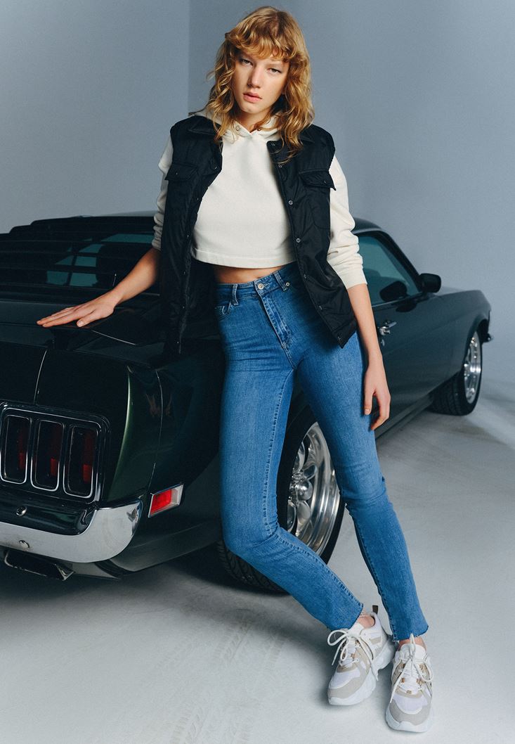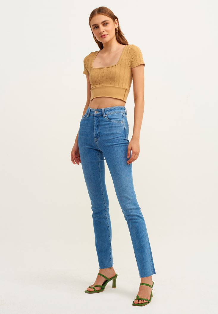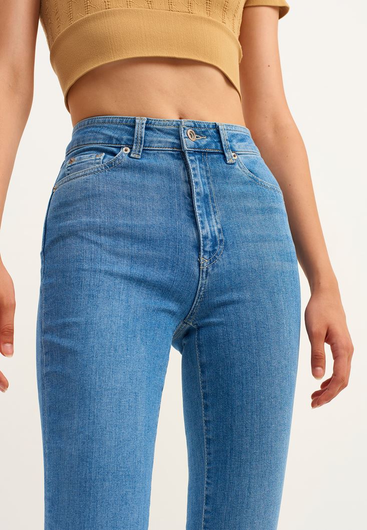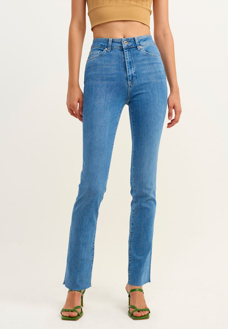 Pamuklu denim doku, ultra yüksek bel, slim fit form, boru paça, paçası kesik detaylı, önü ve arkası iki cepli.