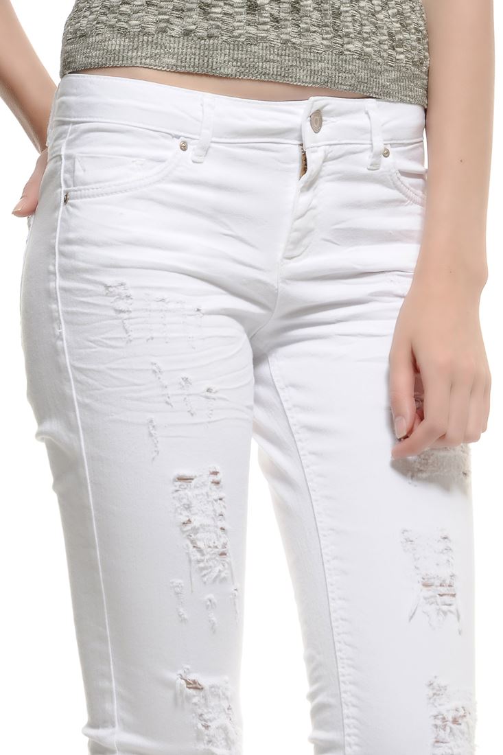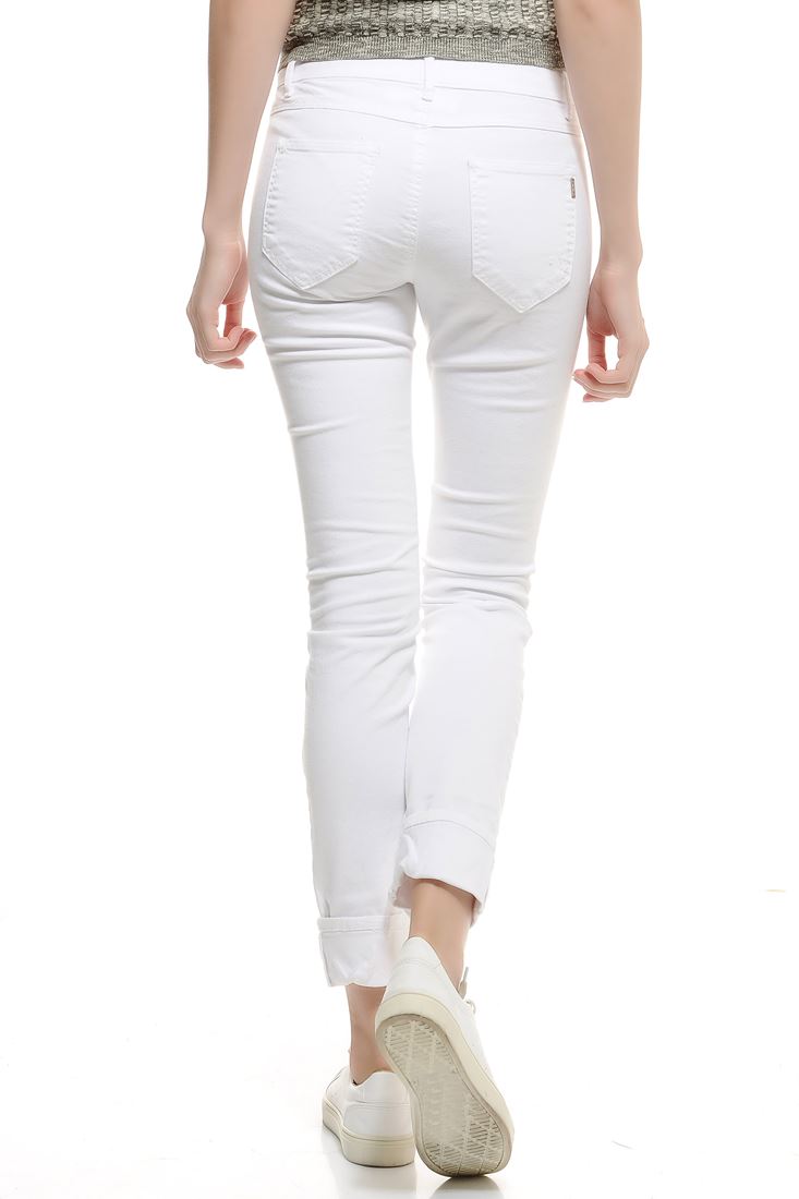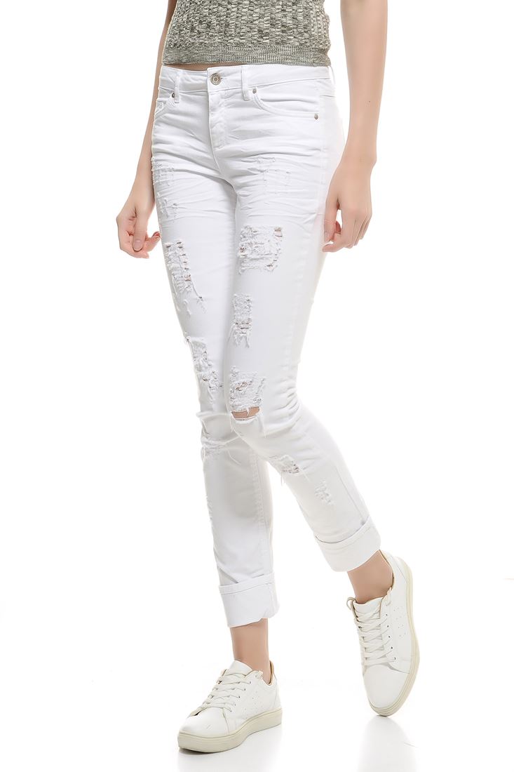 • Bayan Beyaz Slim Paça Yıpratılmış Pantolon