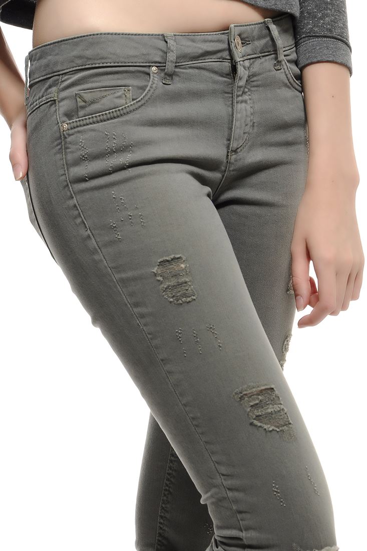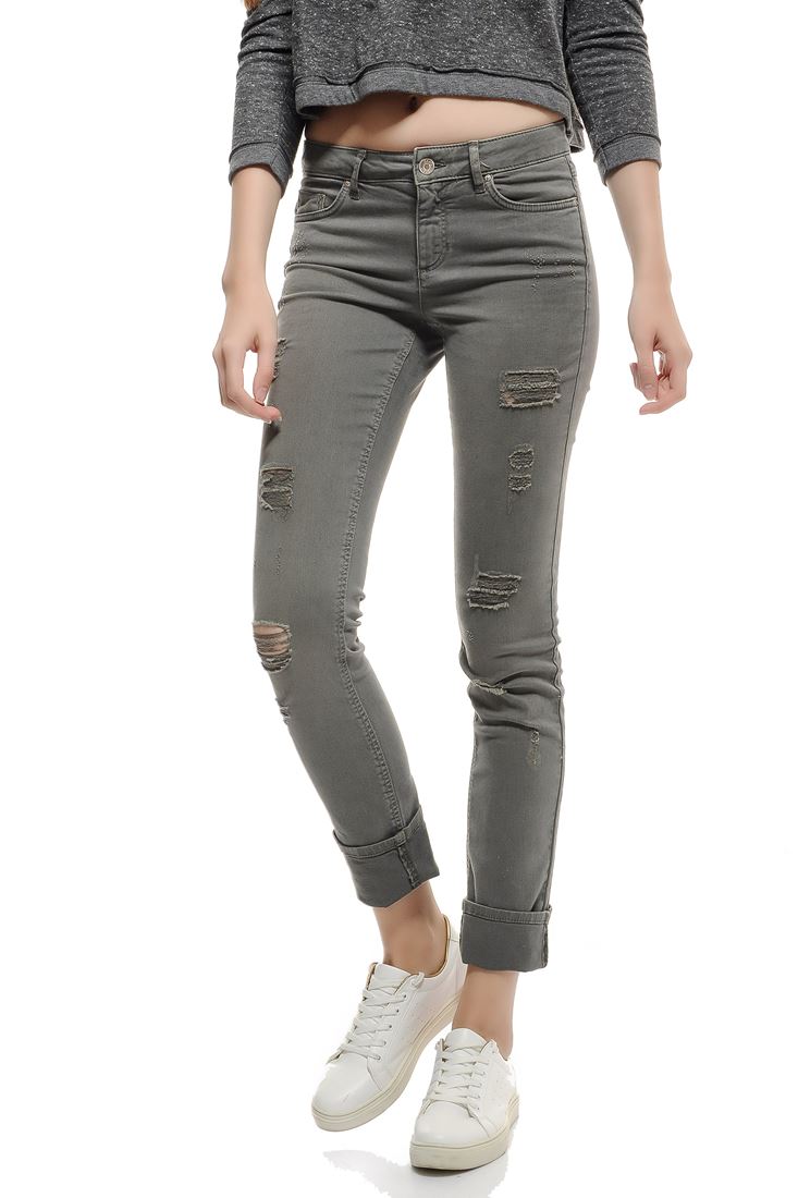 • Bayan Gri Slim Paça Yıpratılmış Pantolon
