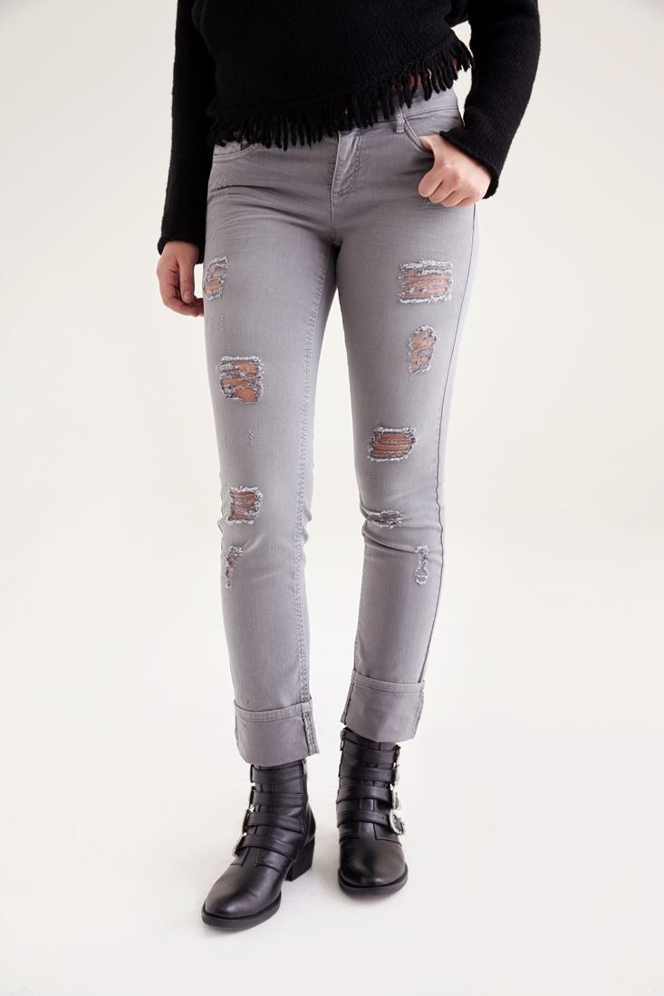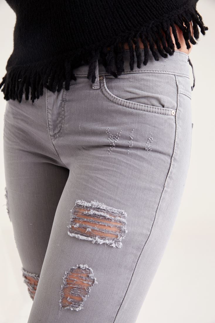• Bayan Gri Slim Paça Yıpratılmış Pantolon