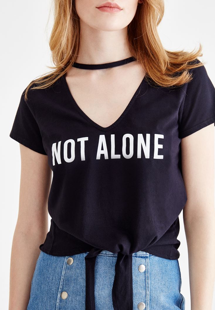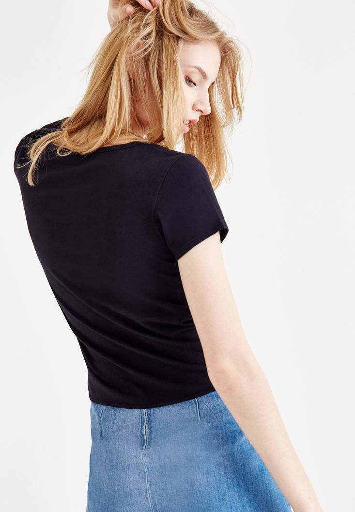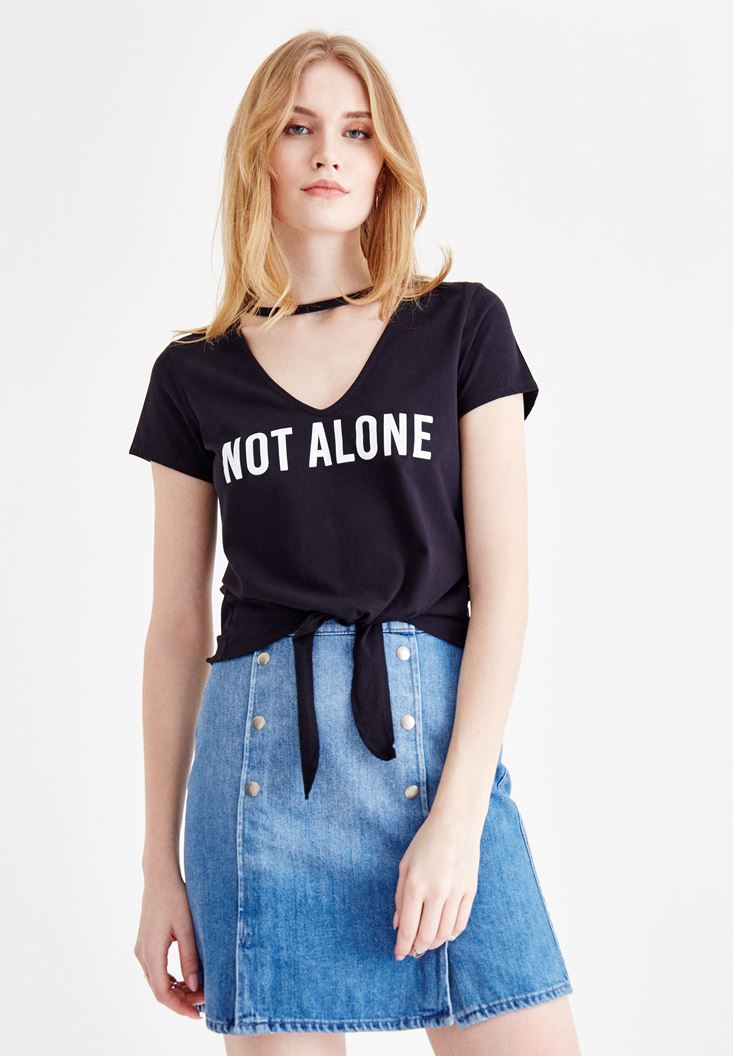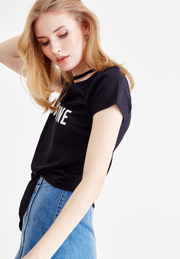 • Bayan Siyah Slogan Baskılı V Yaka Tişört
