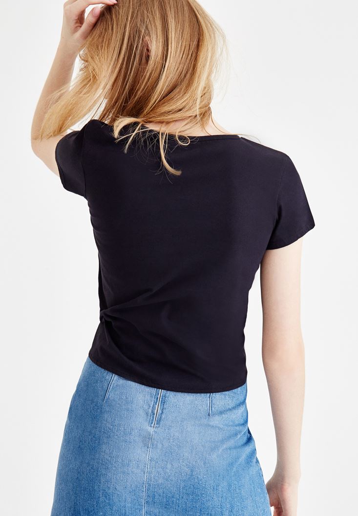Slogan baskili V yaka tisört sahip oldugu sade ve zarif tasarim ile severek kullanacaginiz OXXO tisört modelleri arasinda yer aliyor. Genis V yaka kesimi ile hos bir boyun dekoltesine sahip olan tasarim iki yaka ucunun arasinda bulunan serit detayi ile hareket kazaniyor. Önden baglamali olan tisört modeli sahip oldugu bu detay ile hareket kazanirken ayni zamanda tisörtün ön yüzünde bulunan slogan baskisi da bu hareketi destekliyor. Etek, sort ve jean gibi parçalarla birlikte rahatlikla kombinleyebileceginiz tisört modelleri arasinda yer alan tasarim sahip oldugu pamuk doku sayesinde saglikli bir siklik sunuyor. Pamuk doku tisört modeline yüksek nem emicilik özelligi katarak gün boyu kullanimda rahat etmenize yardimci oluyor.