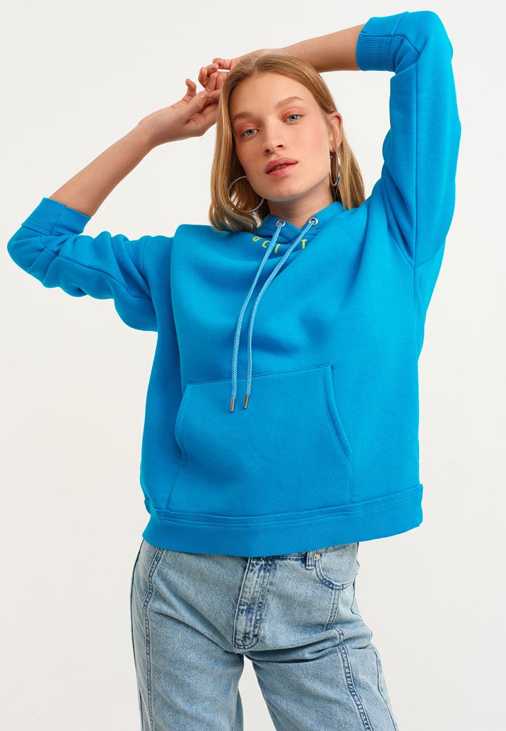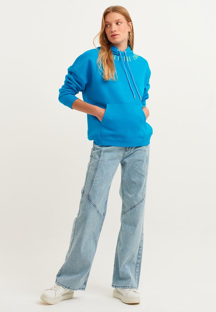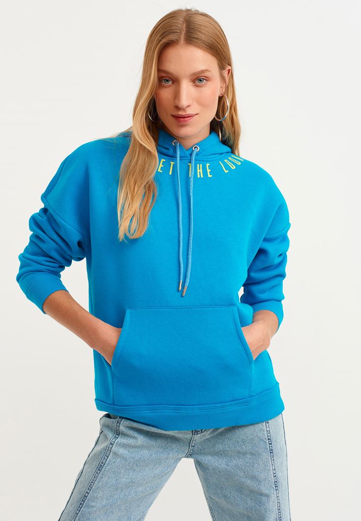 Mavi Sloganlı Kapüşonlu Sweatshirt