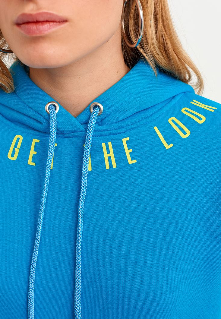 • Bayan Mavi Sloganlı Kapüşonlu Sweatshirt