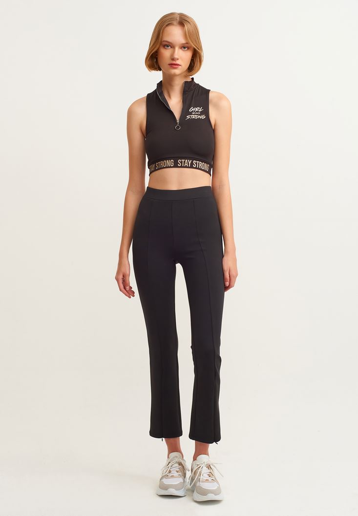 Özel esnek ve yumuşak doku, bedeni saran rahat fit, bel kısmı lastikli ve slogan detaylı, yakası fermuarlı, ön kısmı sloganlı, yüksek yaka, crop kesim.