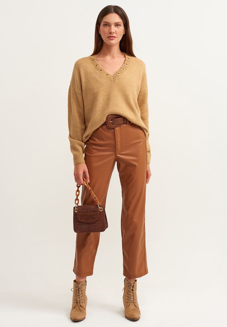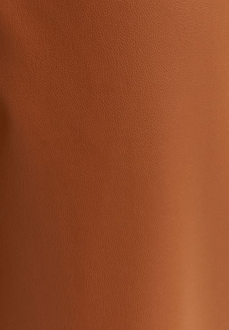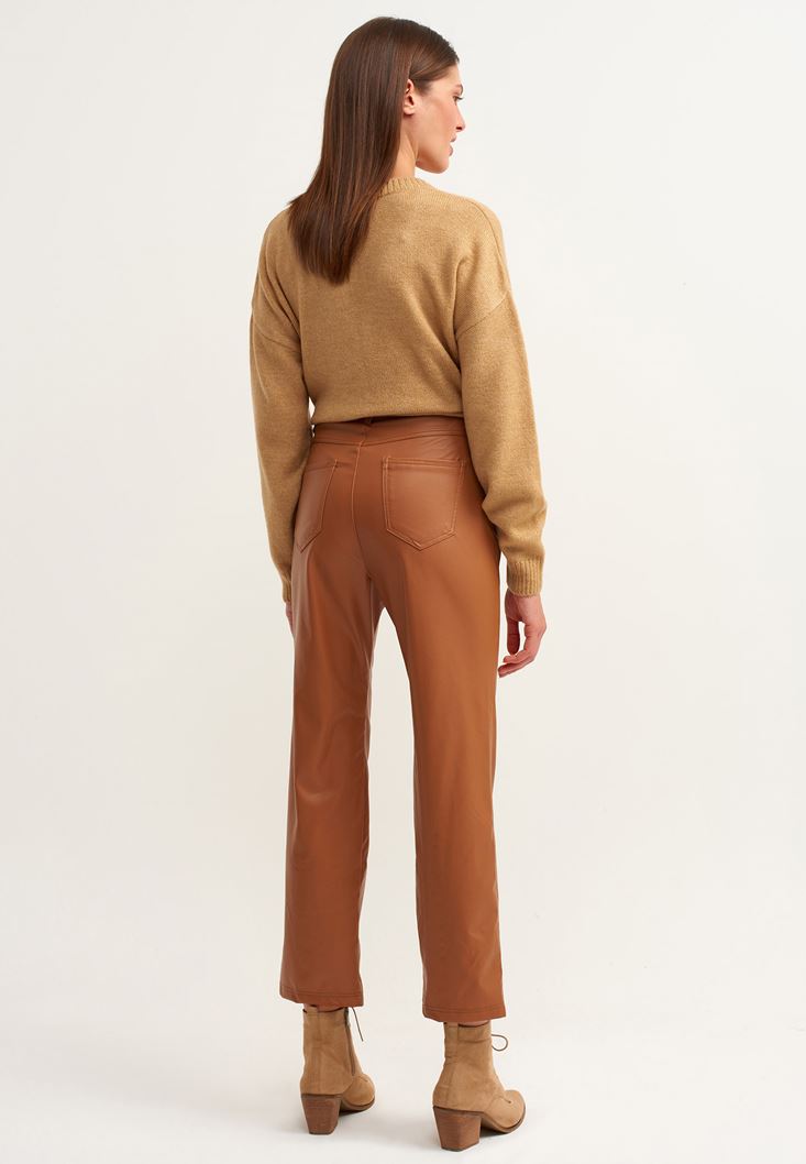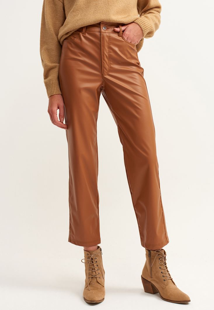 Kahverengi Straight-Fit Vegan Deri Pantolon