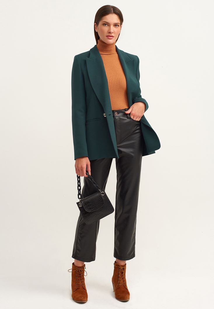 Vegan deri doku, ultra yüksek bel, boru paça, ön ve arka iki cepli, bilekte biten paça boyu.