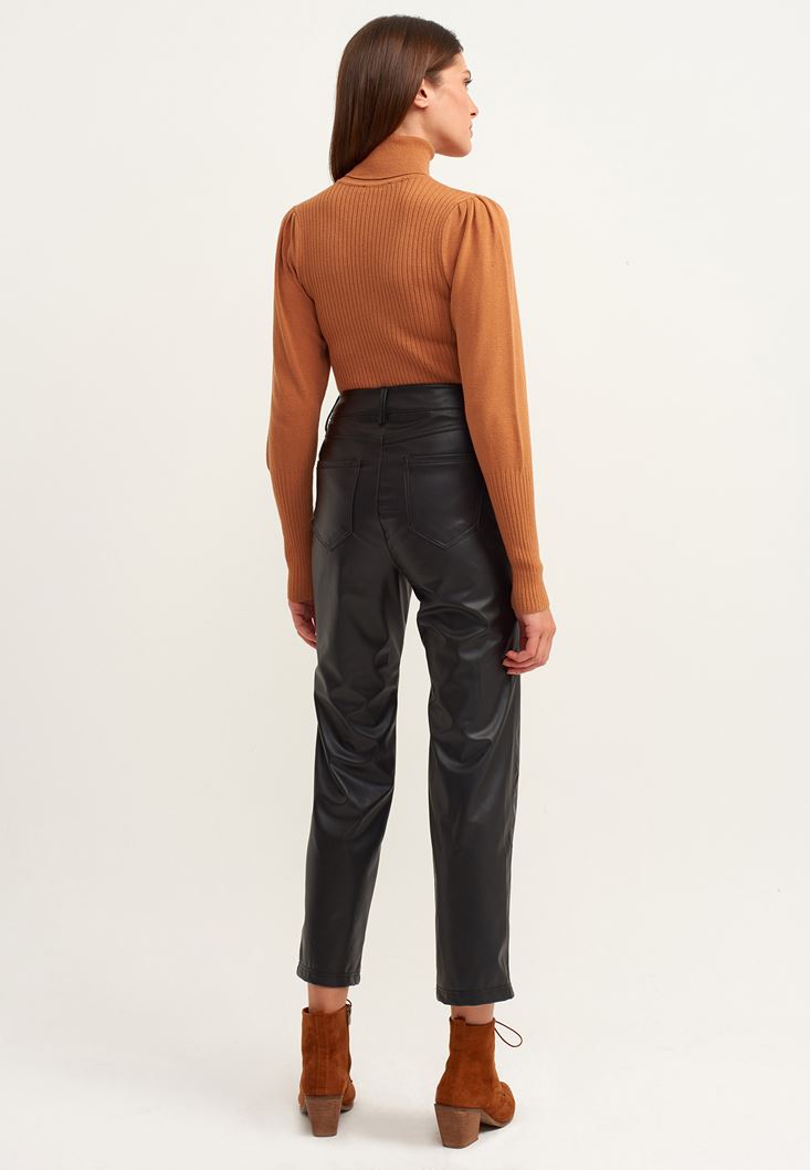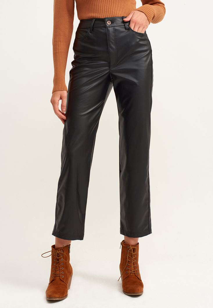 Siyah Straight-Fit Vegan Deri Pantolon