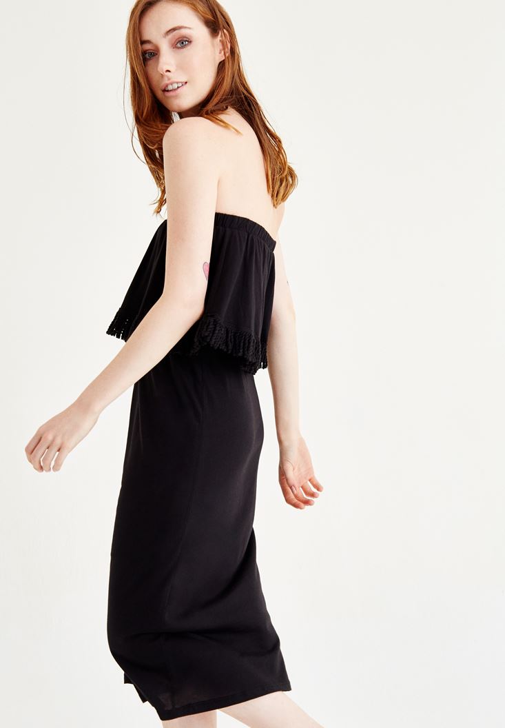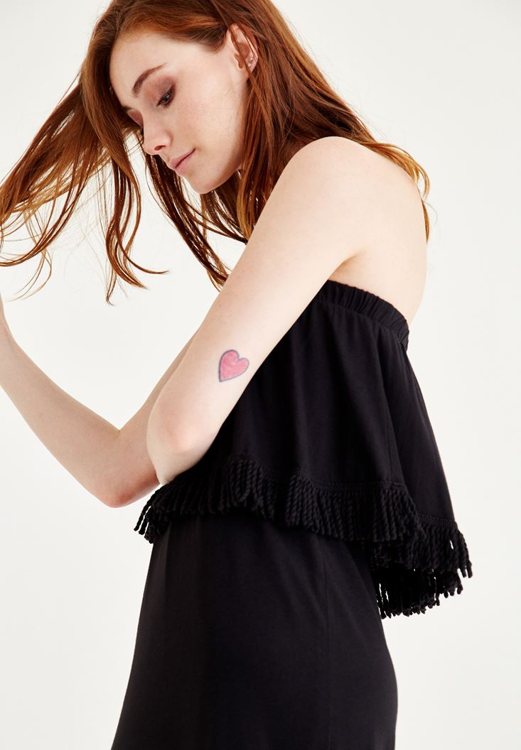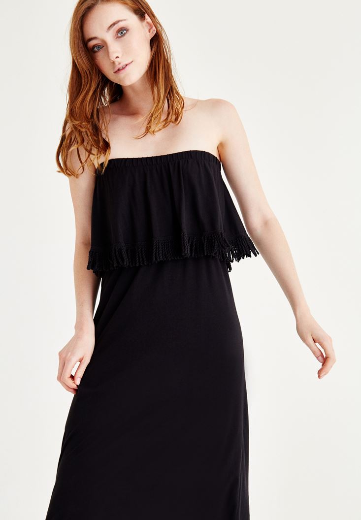 Yaz aylarinin en çok tercih edilen parçalari süphesiz ki elbiseler. Tek parça olusuyla büyük kolaylik saglayan elbiseler, bir sandalet bir clutch ile günü de geceyi de kurtarabiliyor çogu zaman. Straplez uzun elbise ve firfirli detayi ile sik olmanizi saglayacak ve straplez yaka detayi ile omuzlarinizi öne çikartacaktir. Firfirlarinin ucundaki püskül detaylari ile yaz aylarinin dinamikligi ve enerjisini üstünüzde hissedeceksiniz. OXXO straplez elbiseyi ister gündüz ister gece kullanabilirsiniz. Daha sade bir kombin yapmak istediginizde sandalet ya da terlikler ile kombinleyebileceginiz gibi, dolgu topuk, hasir bir clutch ve takilar ile tamamlayarak geceye hazir da olabilirsiniz! Dokusu sebebi ile sik bir görüntüsü olan siyah straplez elbisenin içinde kendinizi bambaska hissedeceksiniz.