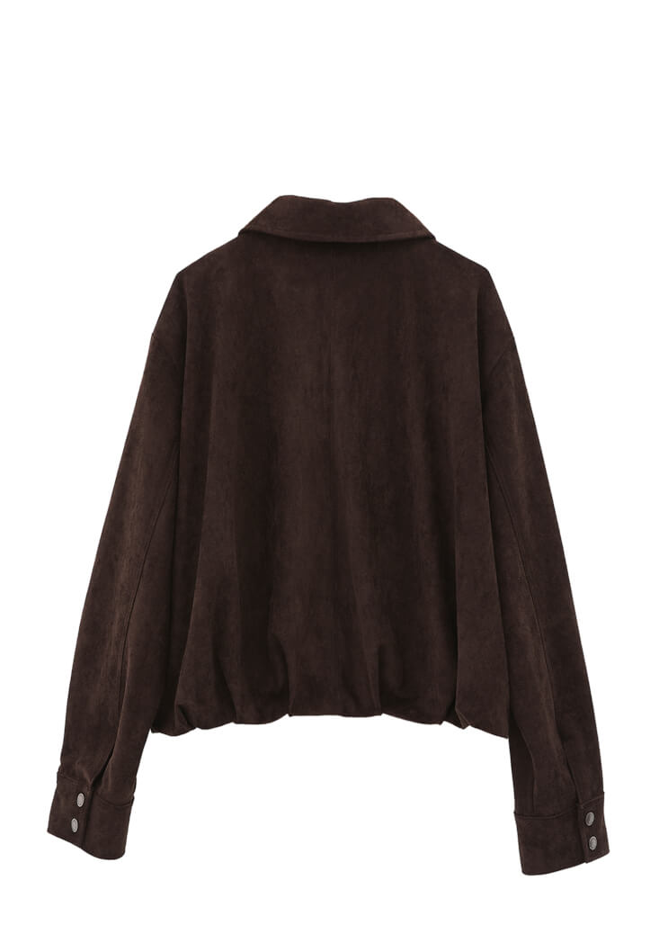 Vegan süet doku, bedenden uzak oversize fit, bomber kesim, uzun kollu, içi astarlı, çıtçıt kapamalı, yüksek yaka.