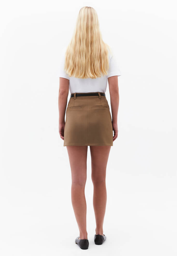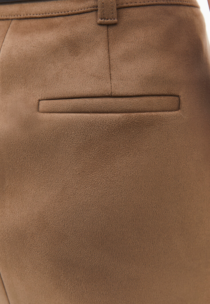 Vegan süet doku, ultra yüksek bel, mini kesim, arka kısmı cep görünümlü, bedene yakın fit.