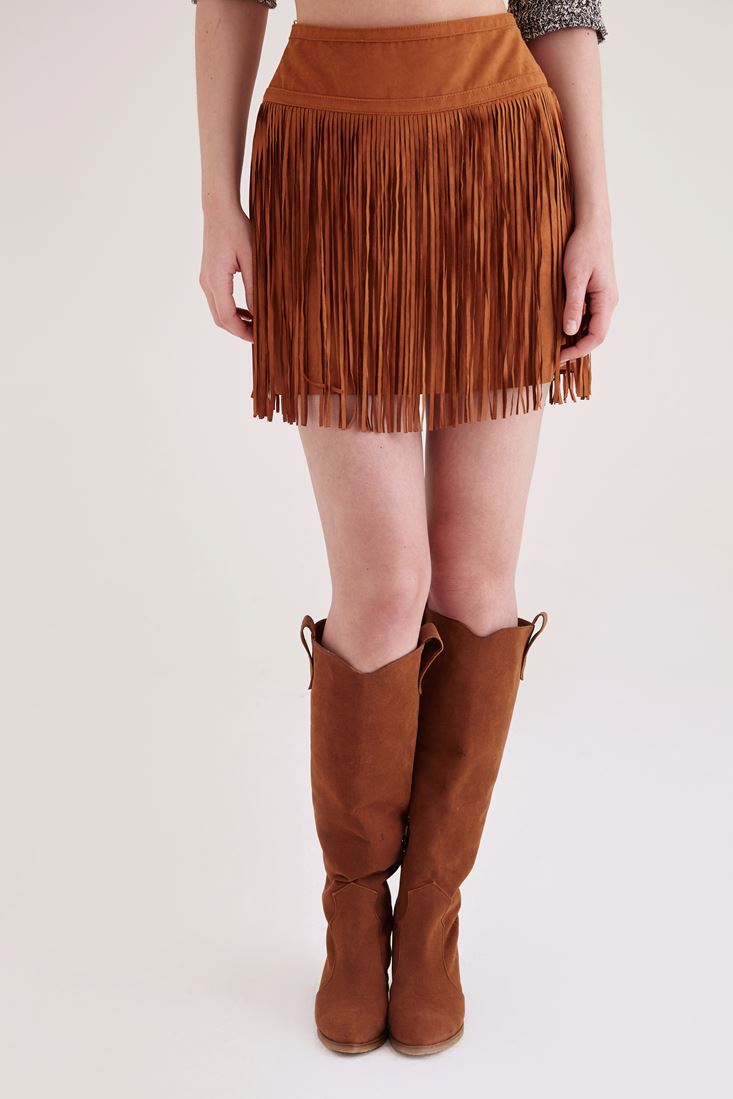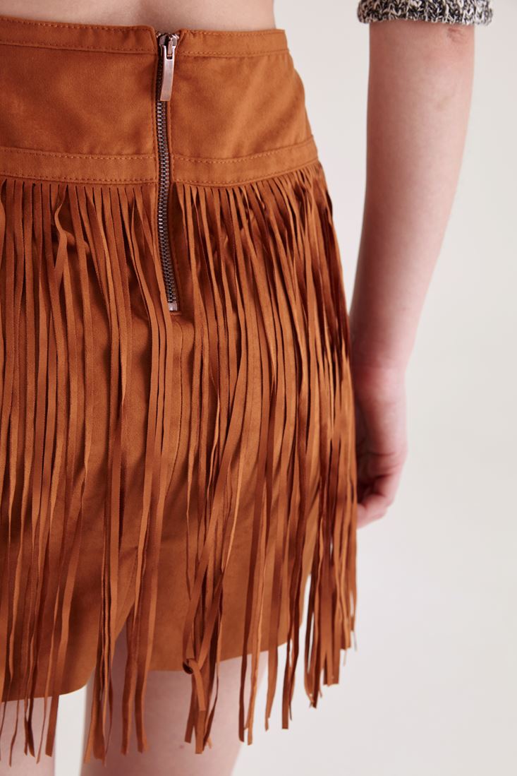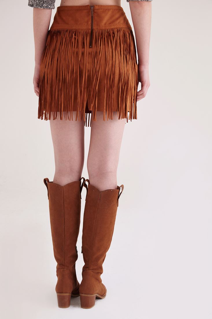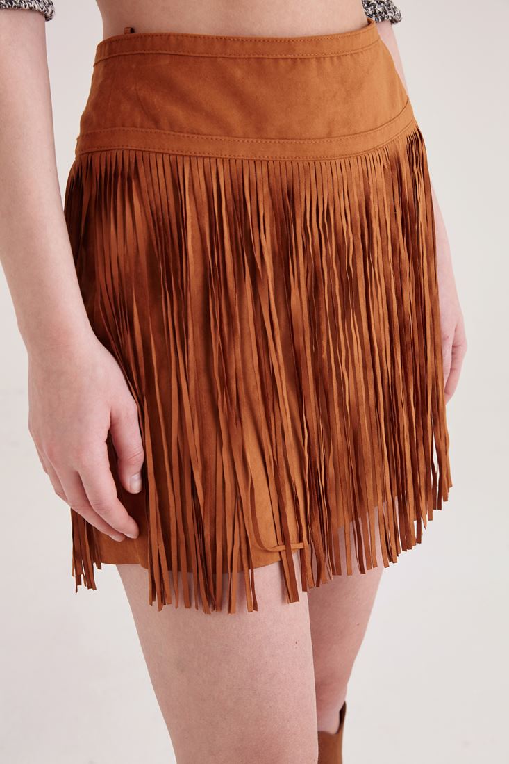 • Bayan Kahverengi Süet Mini Püsküllü Etek