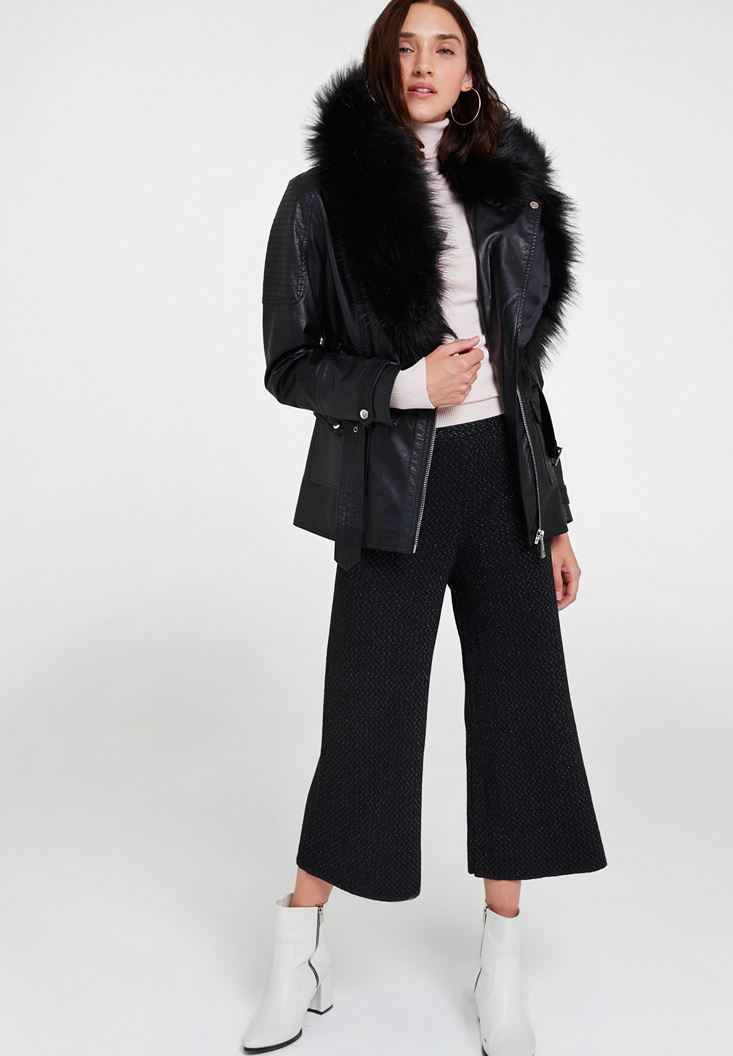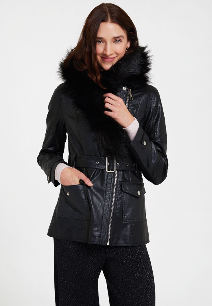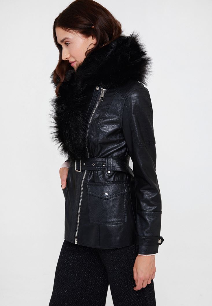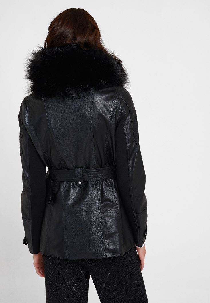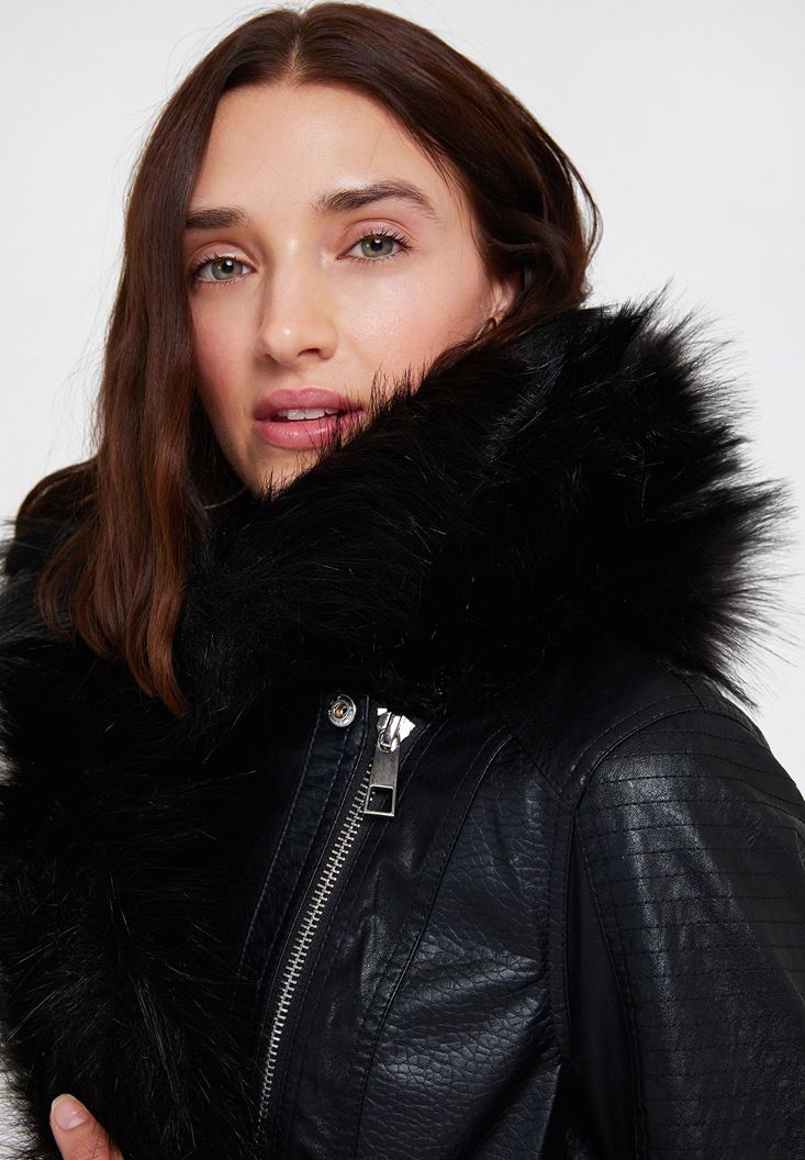 Siyah Suni Kürk Detaylı Deri Ceket