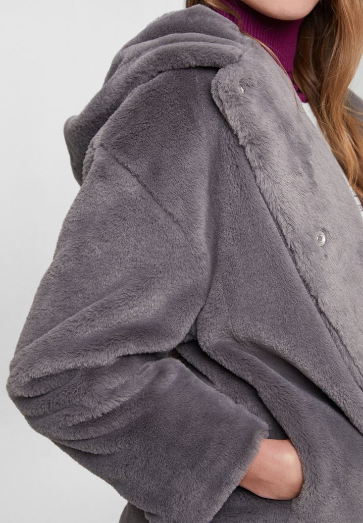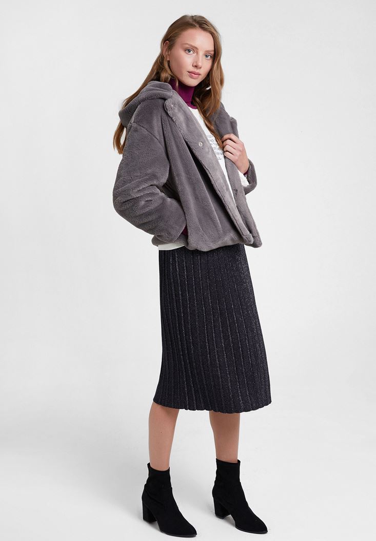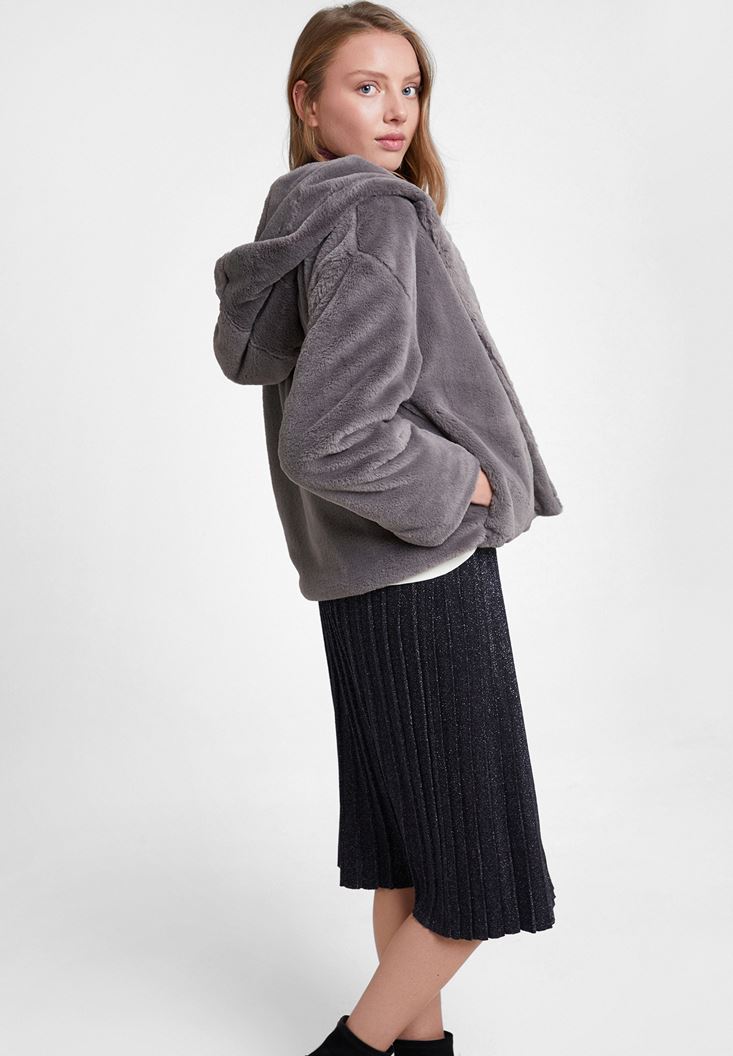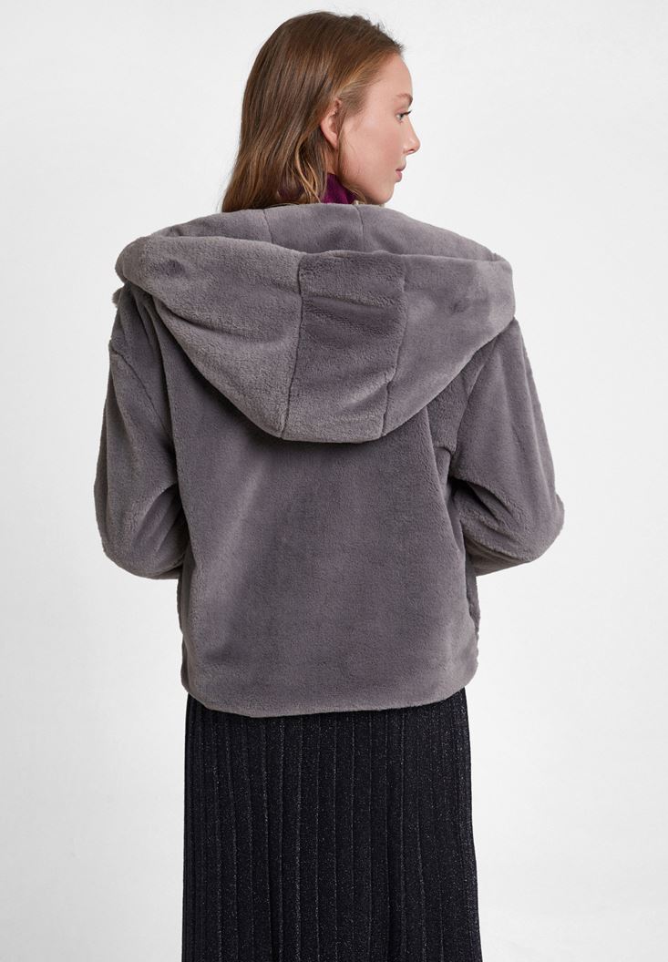 • Bayan Gri Suni Kürk Kapüsonlu Ceket