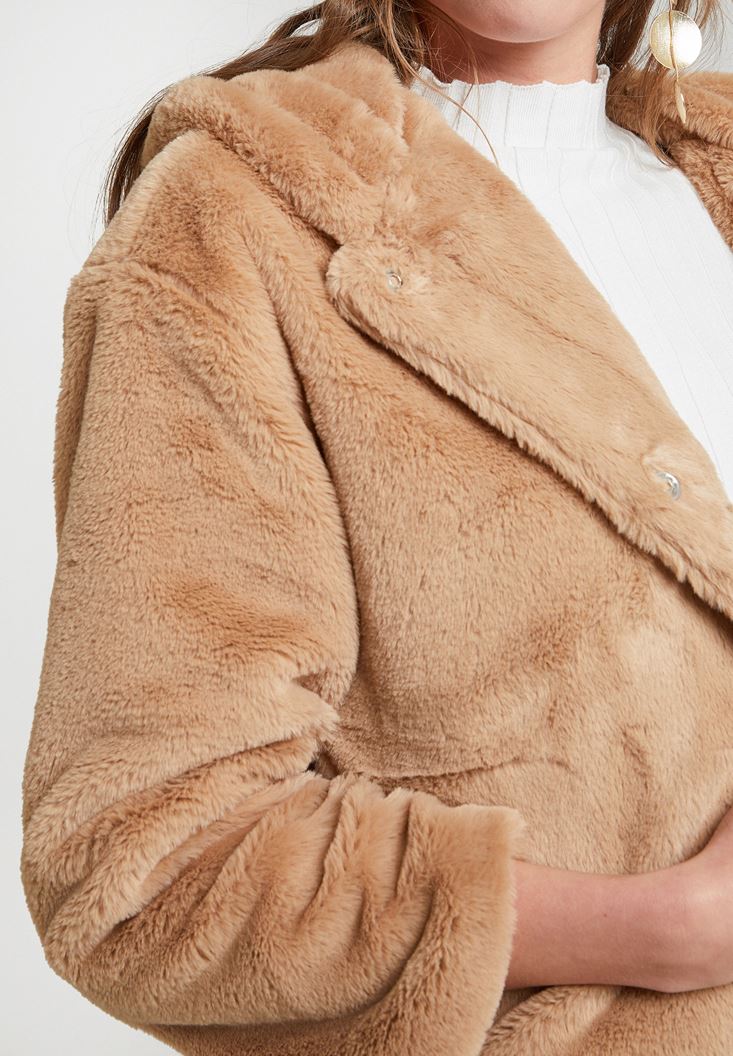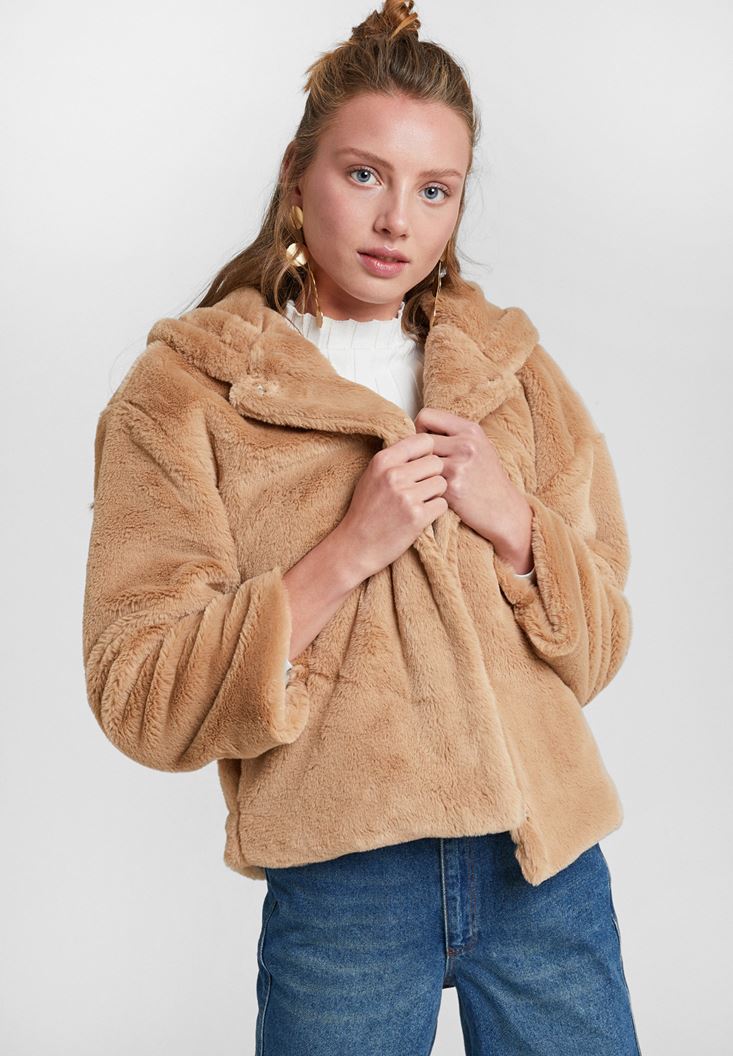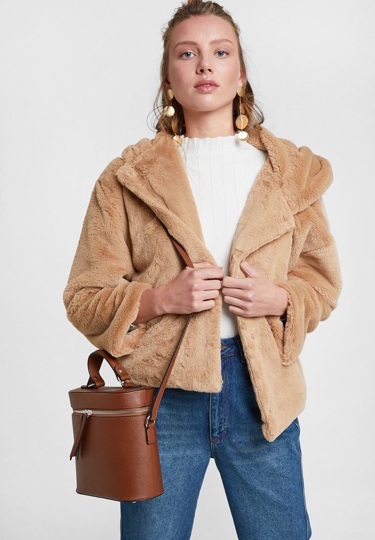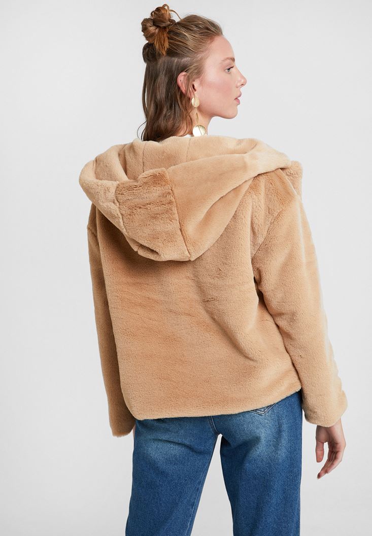Kahverengi Suni Kürk Kapüsonlu Ceket