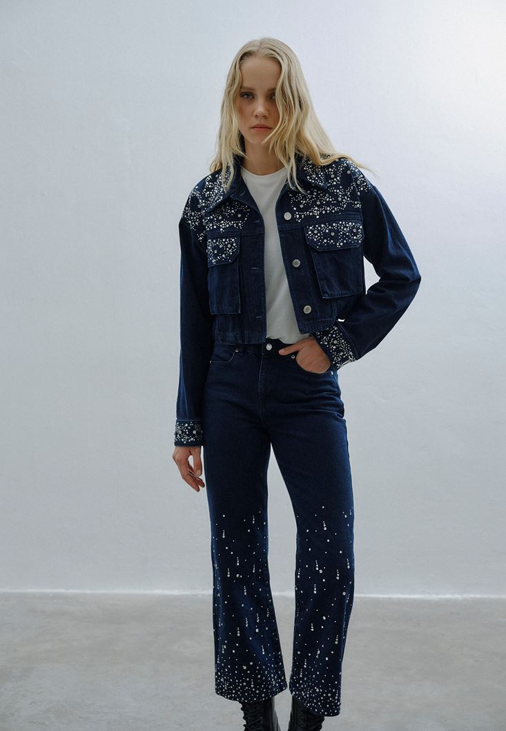 Denim şıklığını en üst seviyeye taşıyacak olan crop ceket modeli şimdi sizlerle! %100 pamuk içerikli doğal dokusu, ışıltılı taş işlemeleri ve crop kesimiyle dikkat çeken denim ceket, şimdi sizin olmalı… Ekstra şık görünümü sayesinde stilinize farklılık katacak olan bu parçayı aynı dokudaki denim pantolonlarla kombinleyebilirsiniz. Hem özel anlar hem de günlük hayatınızdaki görünümü bu parça ile destekleyerek mükemmel bir enerji yakalayabilirsiniz!😎