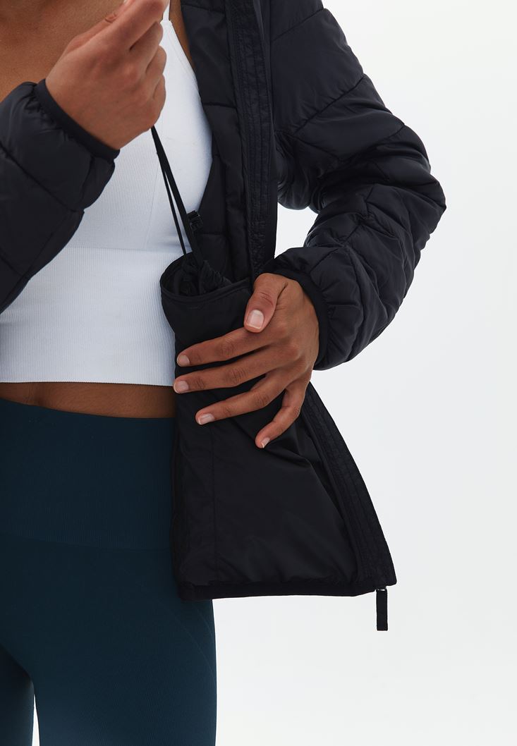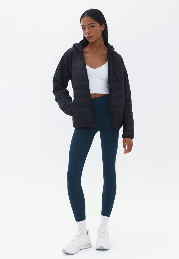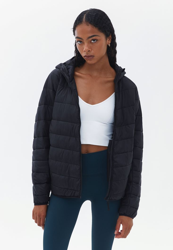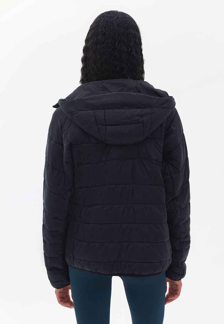 Kapitone dikişli doku, bedene yakın fit, kapüşonlu, taşınabilir çantalı, iki cepli, fermuar kapamalı, beli ve kol ucu lastikli.