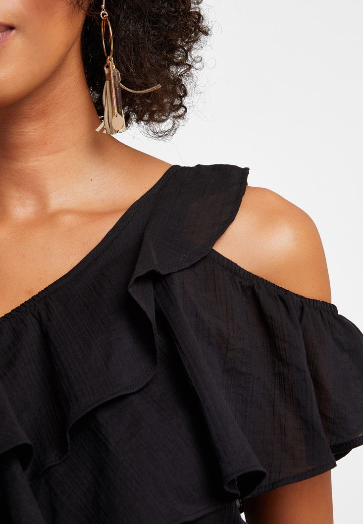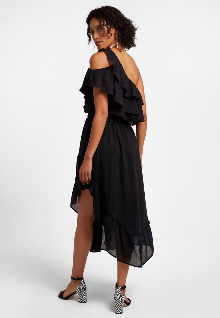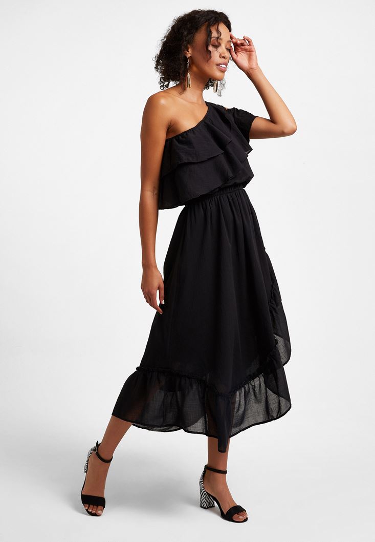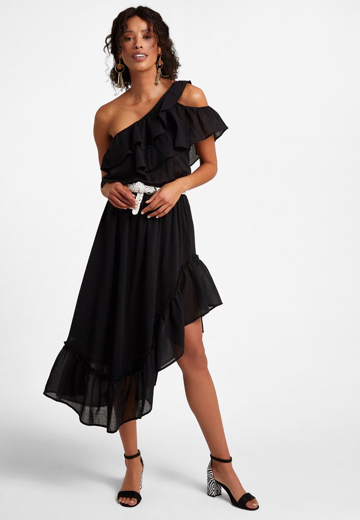 Siyah Tek Omuz Asimetrik Kesim Elbise