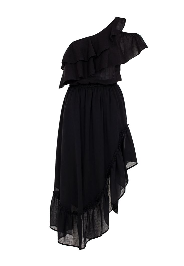 • Bayan Siyah Tek Omuz Asimetrik Kesim Elbise