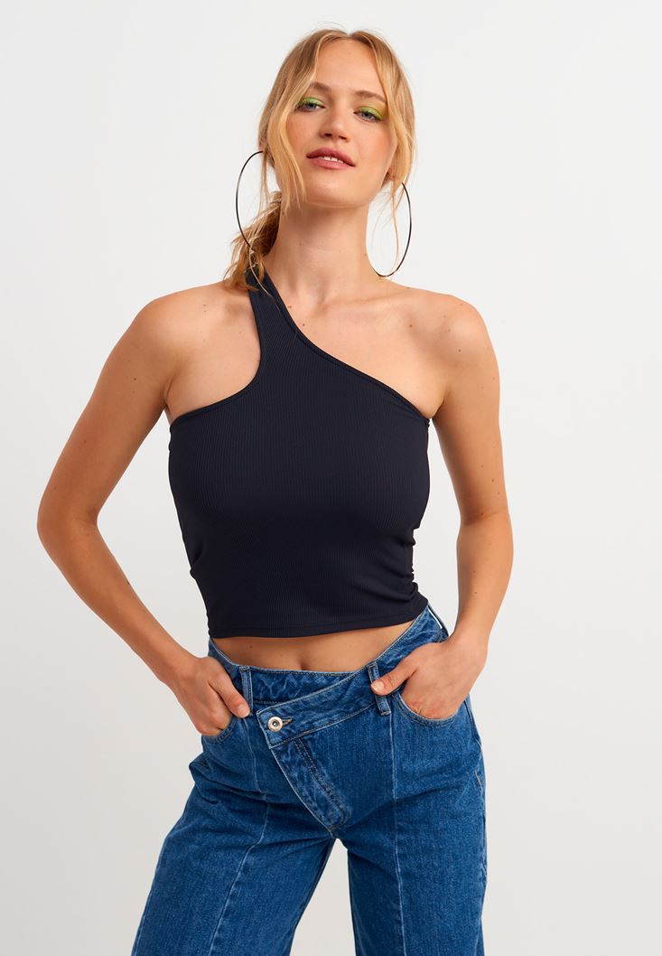 Fitilli özel esnek doku, crop kesim, asimetrik tek omuz detaylı, bedeni saran rahat kalıp, kalın askılı.