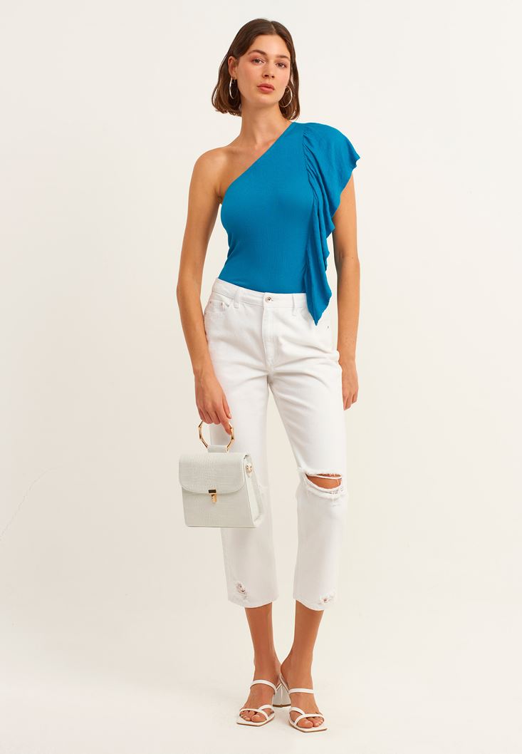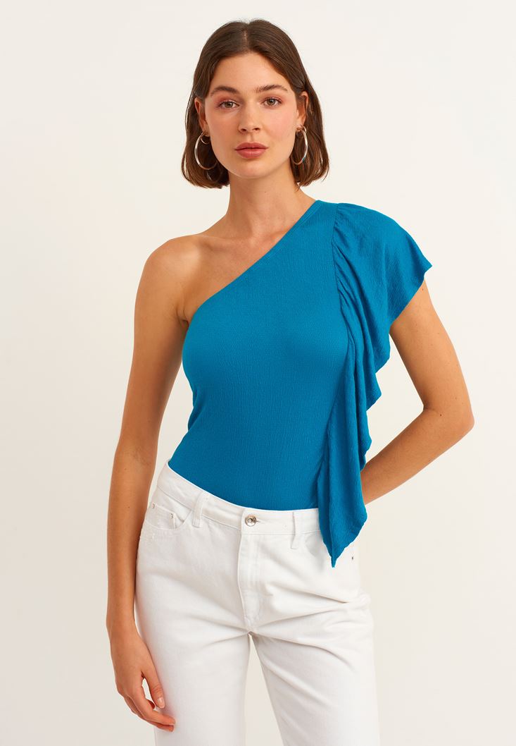 • Bayan Mavi Tek Omuz Fırfır Detaylı Bluz