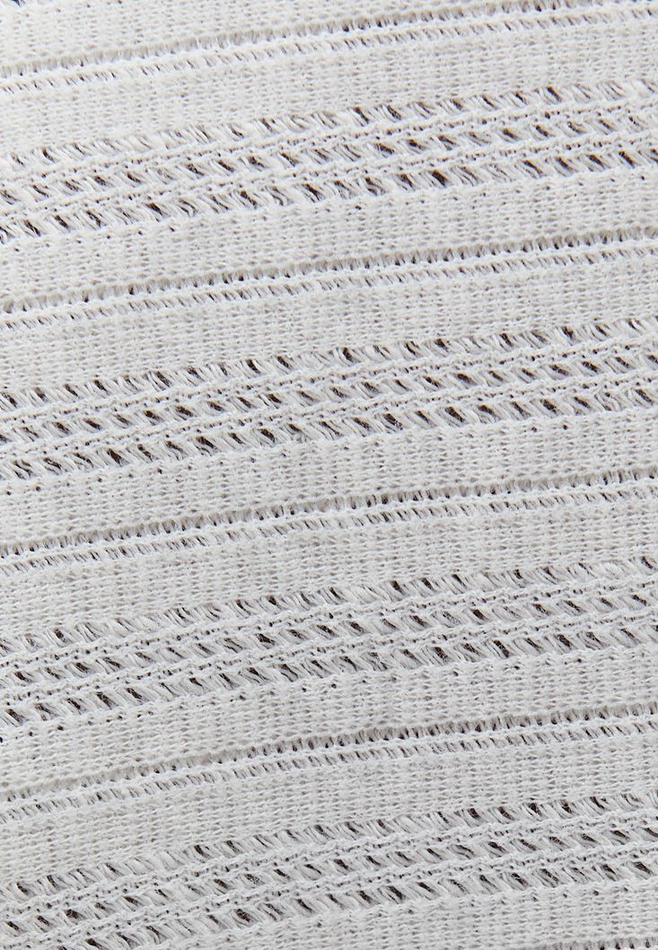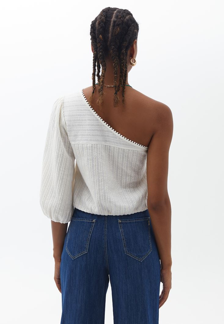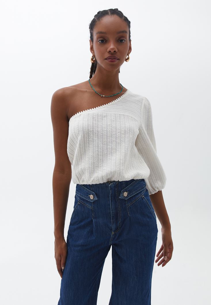 Dokulu özel kumaş, tek omuz detaylı, beli ve kol ucu lastikli, crop kesim, bedene yakın fit.