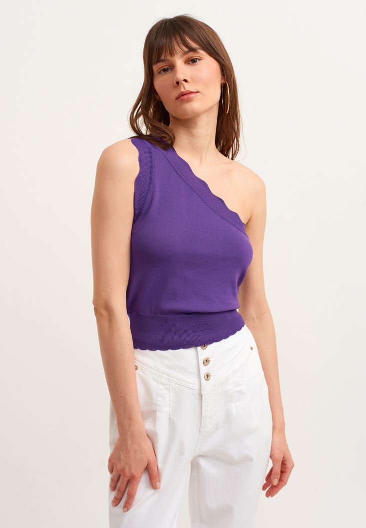 Viskon karışımlı özel triko doku, asimetrik tek omuz detayı, omuz, yaka ve etek ucu ajurlu, bedeni saran close-fit, crop kesim.