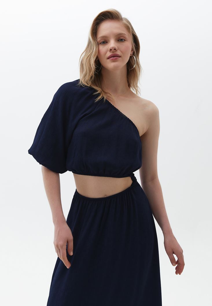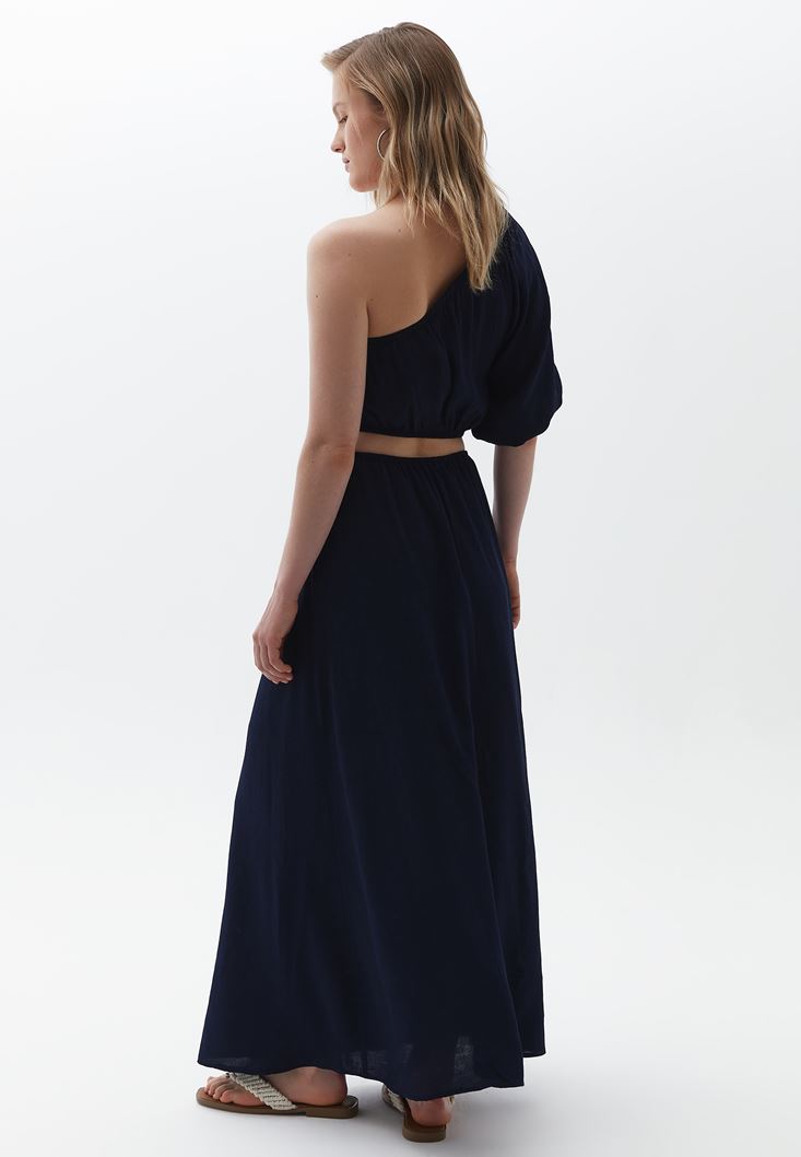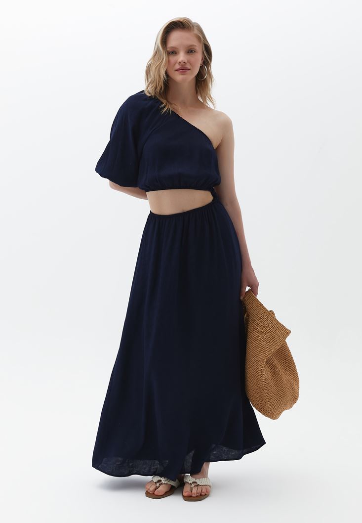 • Bayan Lacivert Tek Omuzlu Uzun Elbise