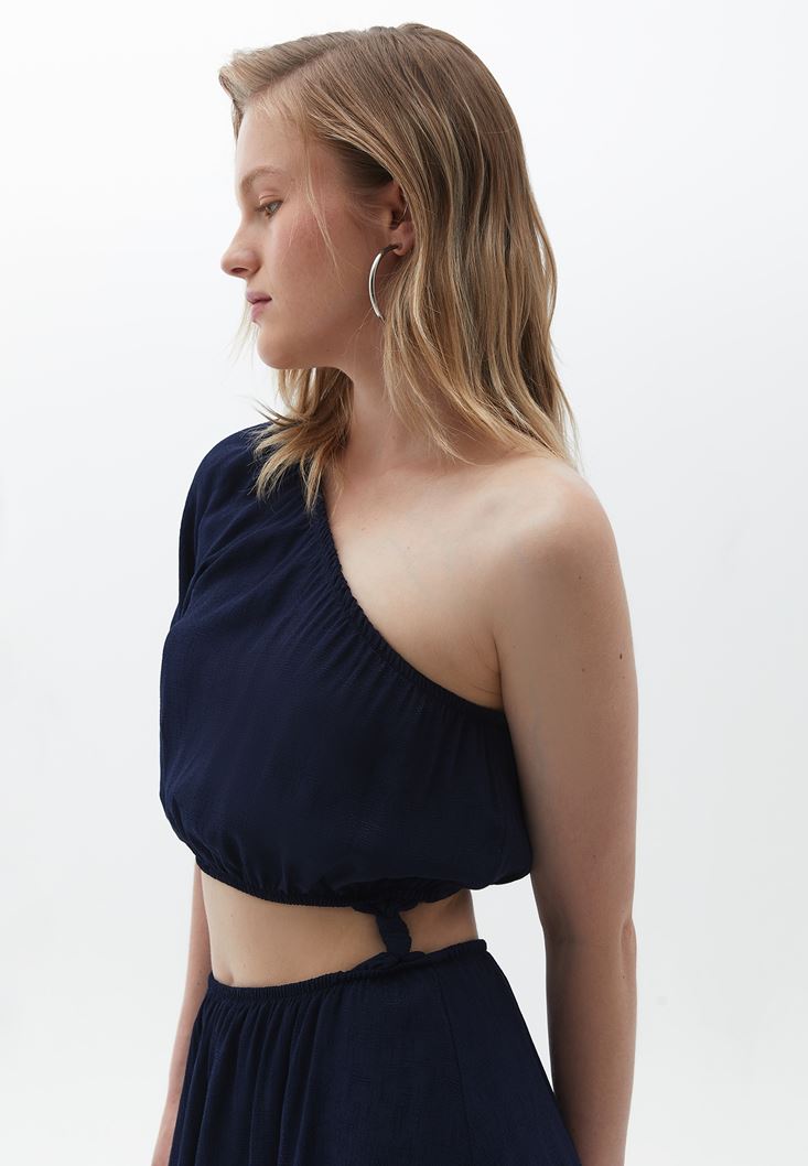 %100 viskon içerikli, tek omuz detaylı, bel kısmı lastikli, beli düğüm detaylı, yarım kollu, a kesim etek, içi astarlı.
