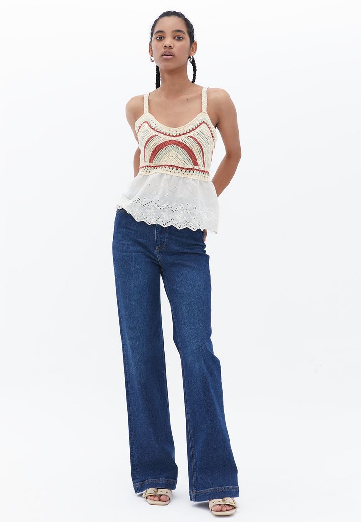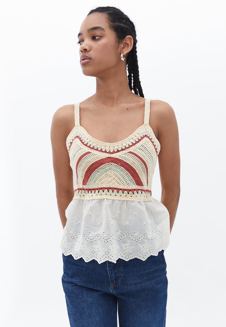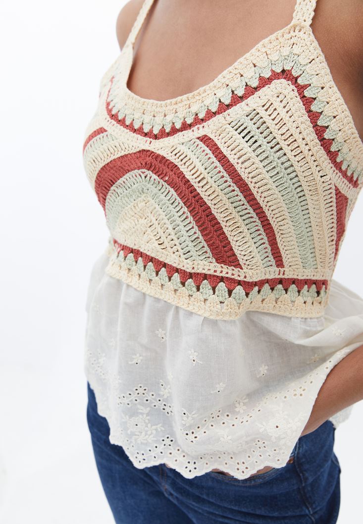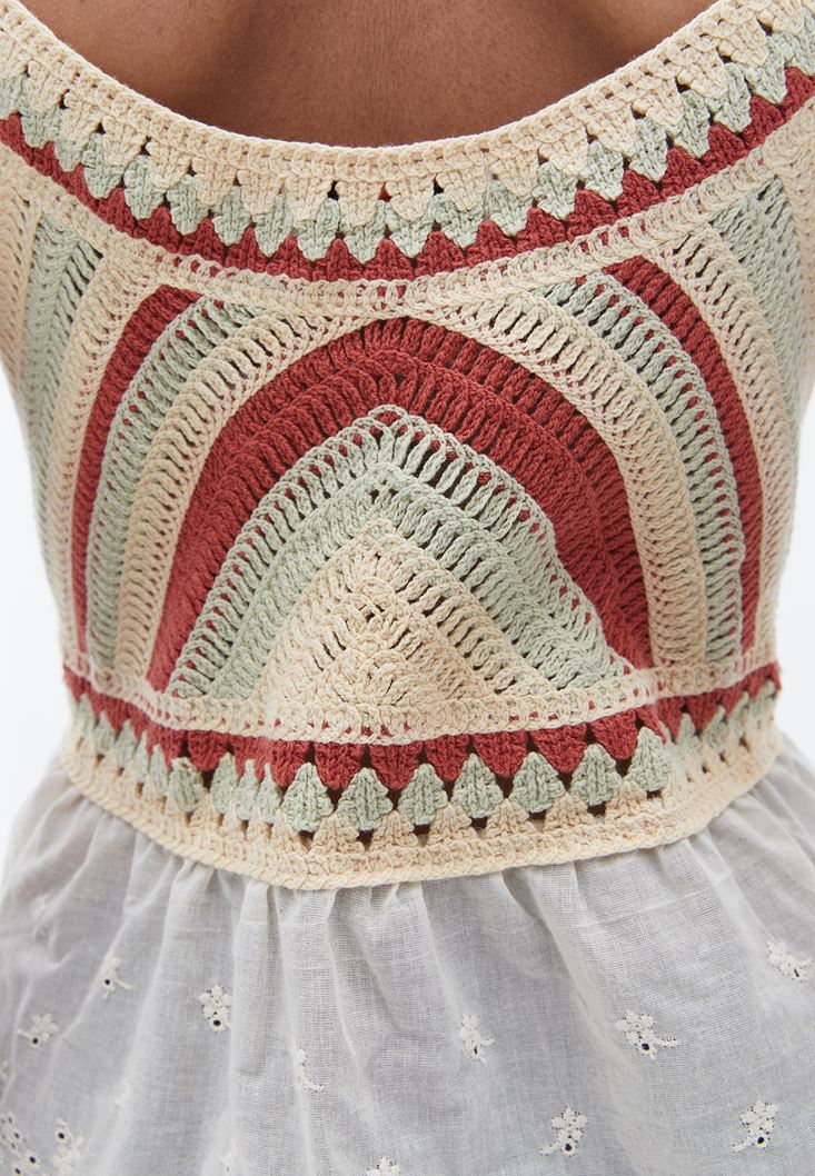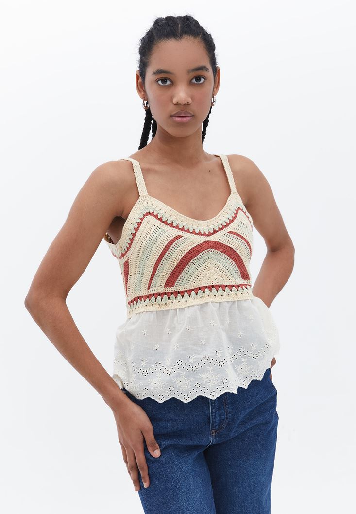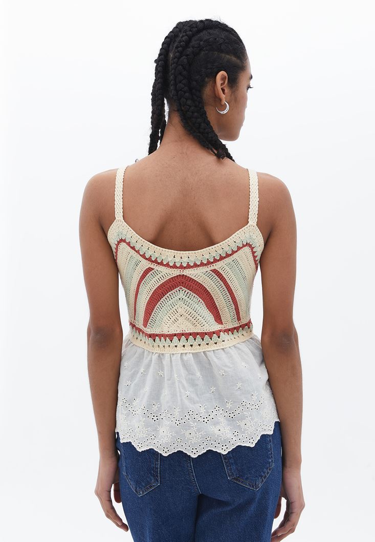 Dantel örgü ve poplin kumaşlı mix match tasarım, bedene yakın fit, ince askılı, derin yaka, üst kısmı dantel örgülü, alt kısmı nakışlı doku.