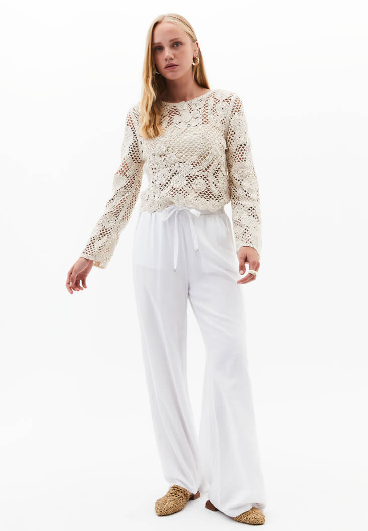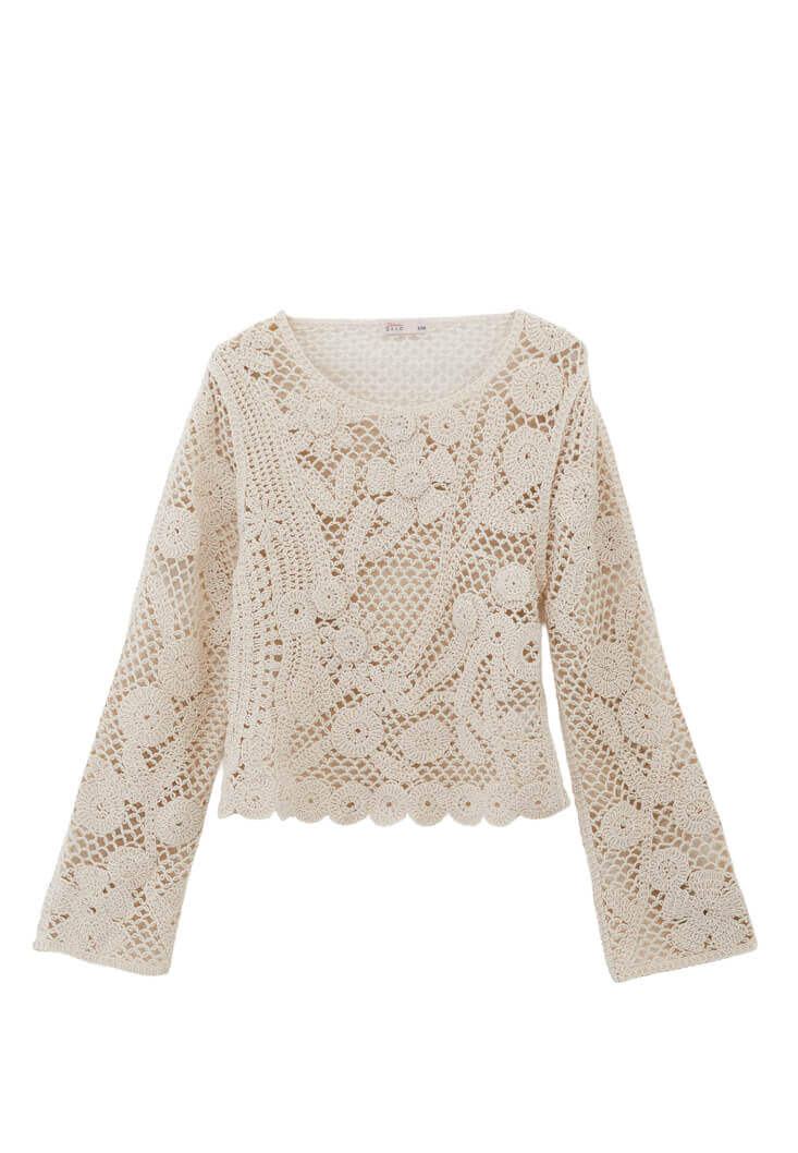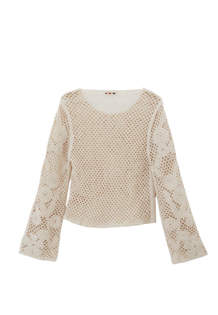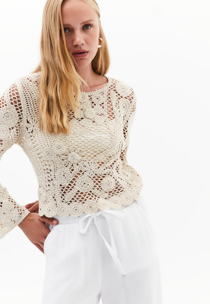 %100 pamuk içerikli, ajurlu örgü, bedene yakın rahat fit, uzun kollu, sıfır yaka, motifli örgü, crop kesim.