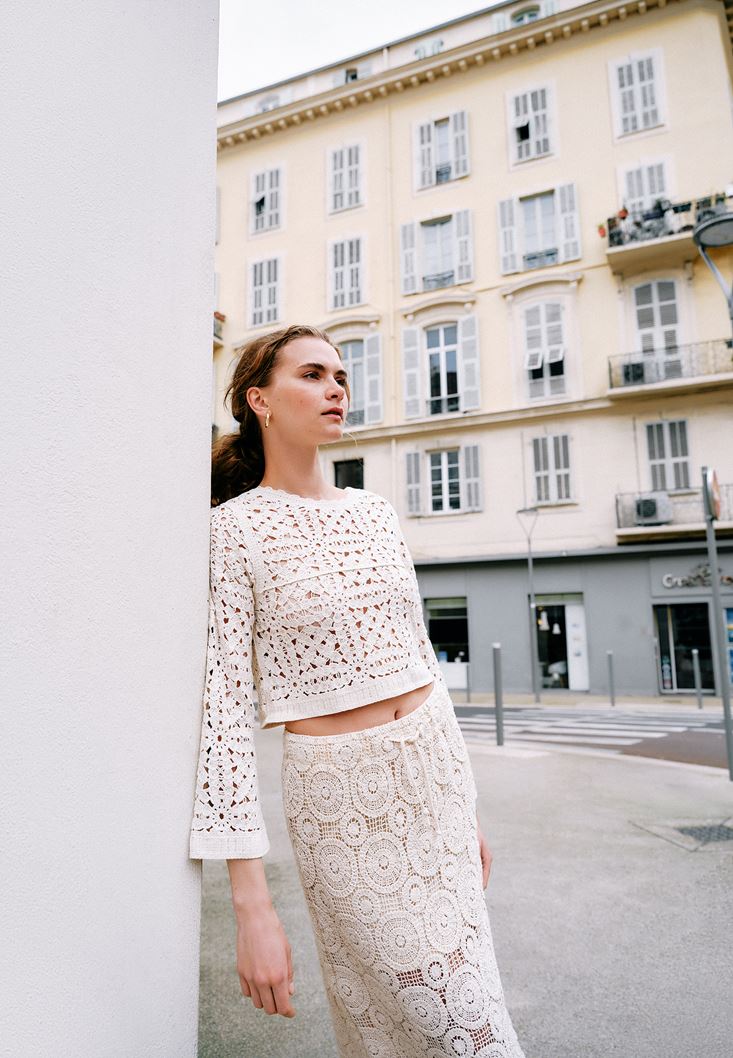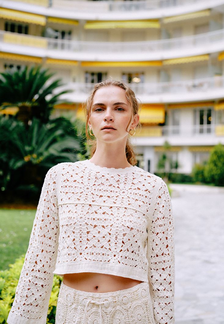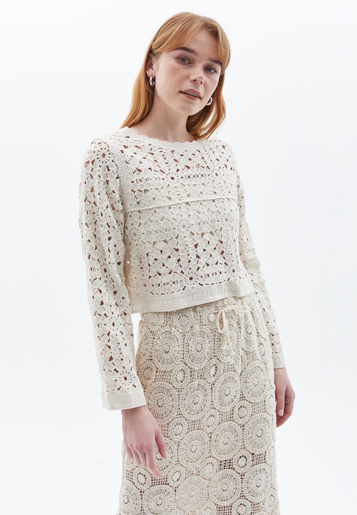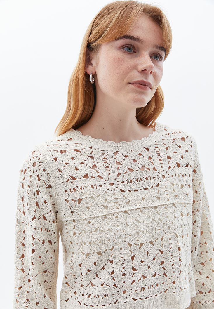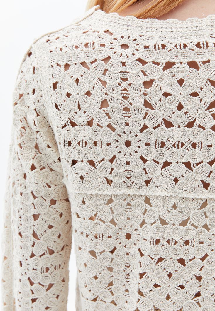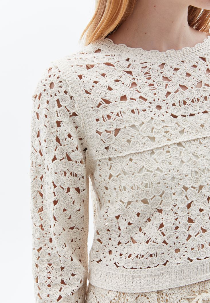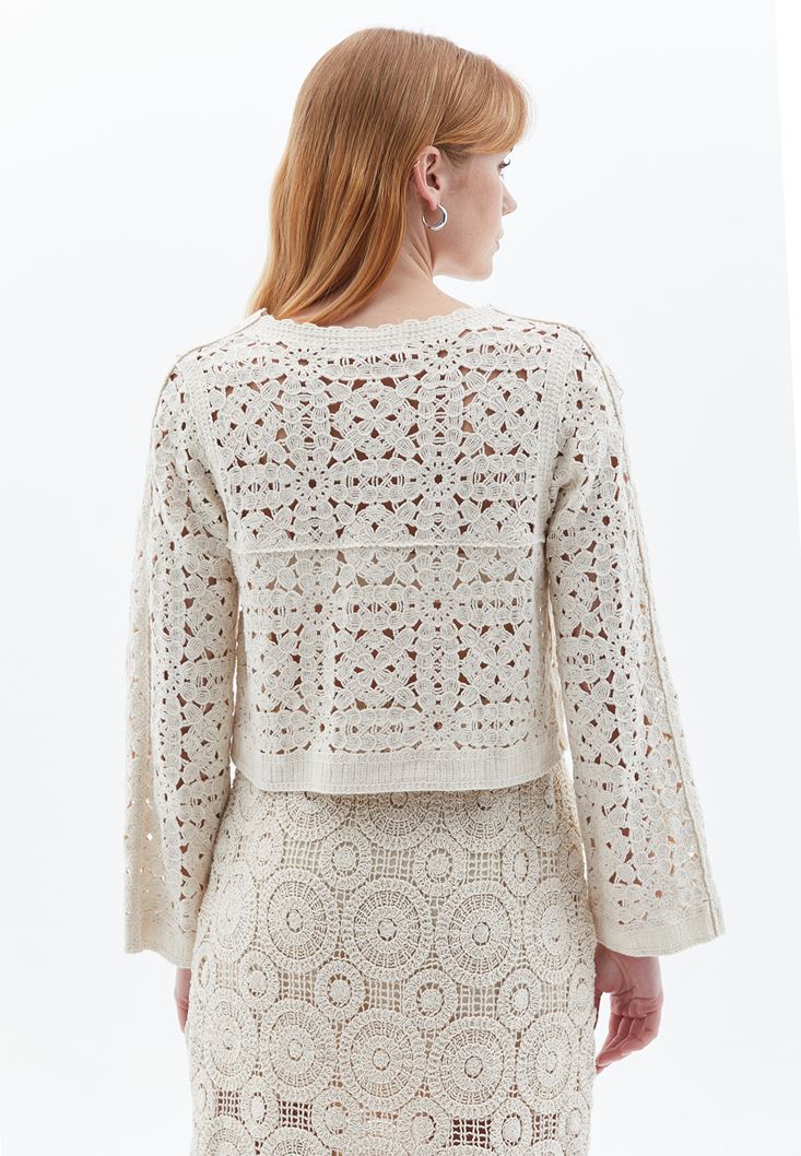 %100 pamuk içerikli doğal doku, tığ işi örgü, sıfır yaka, uzun kollu, crop kesim, bedene yakın rahat fit.