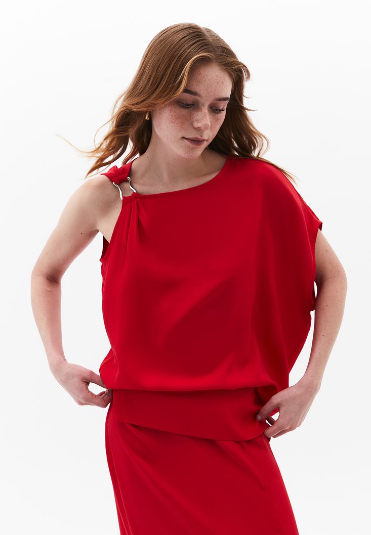 Kırmızı Toka Detaylı Asimetrik Kesim Bluz