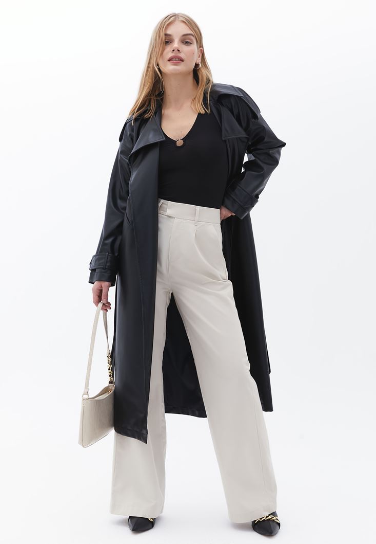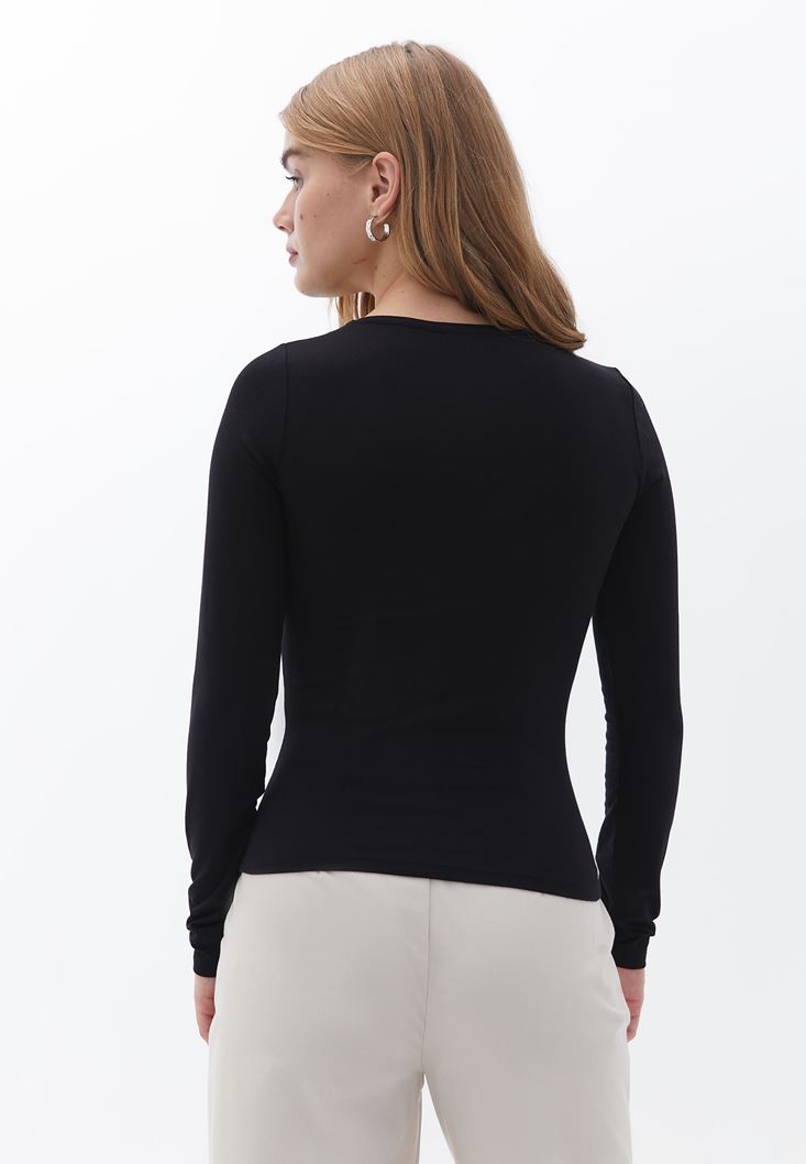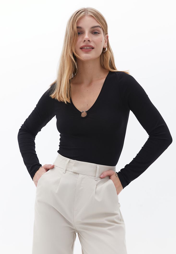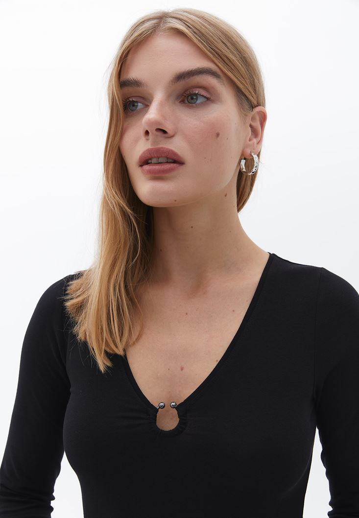 Pamuk ve modal karışımlı özel doku, V yaka, uzun kollu, yakası aksesuar detaylı, bedeni saran fit.