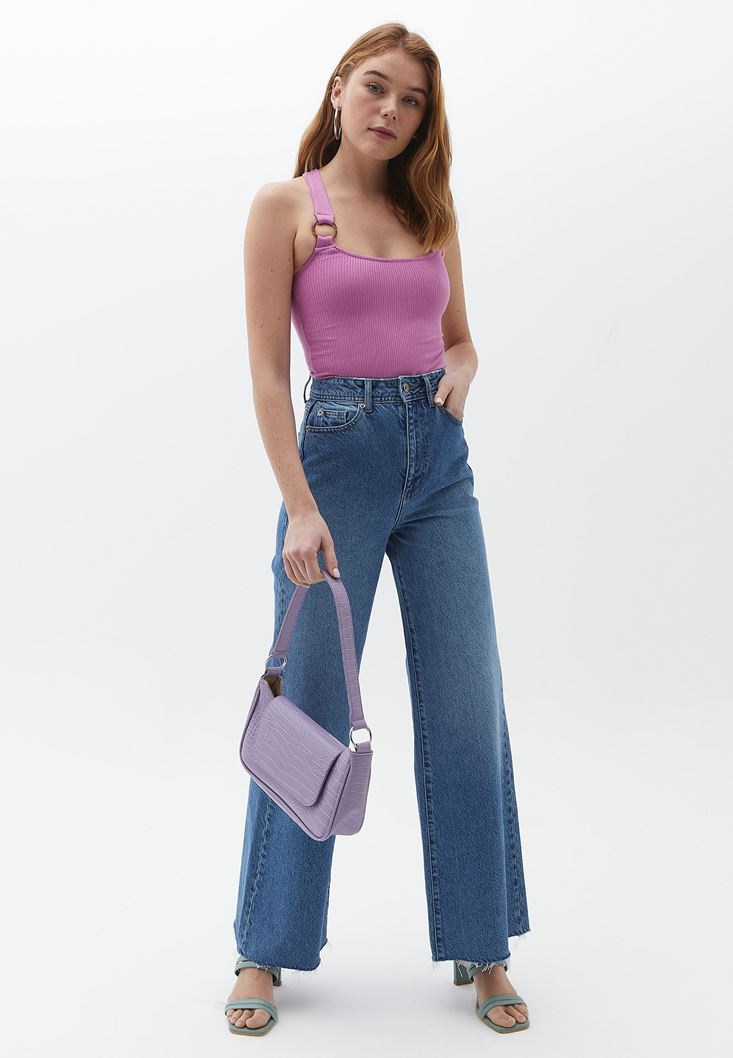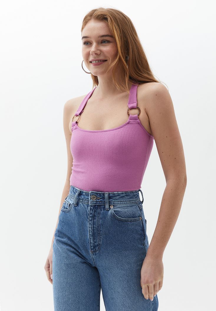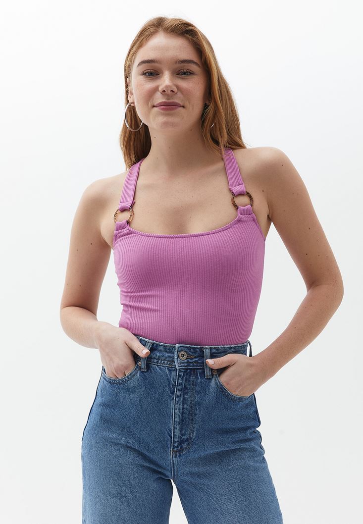Pamuk ve modal karışımlı özel doku, kalın askılı, bedeni saran esnek kalıp, askıları halka detaylı, sırt kısmında birleşen çapraz askı tasarımı.