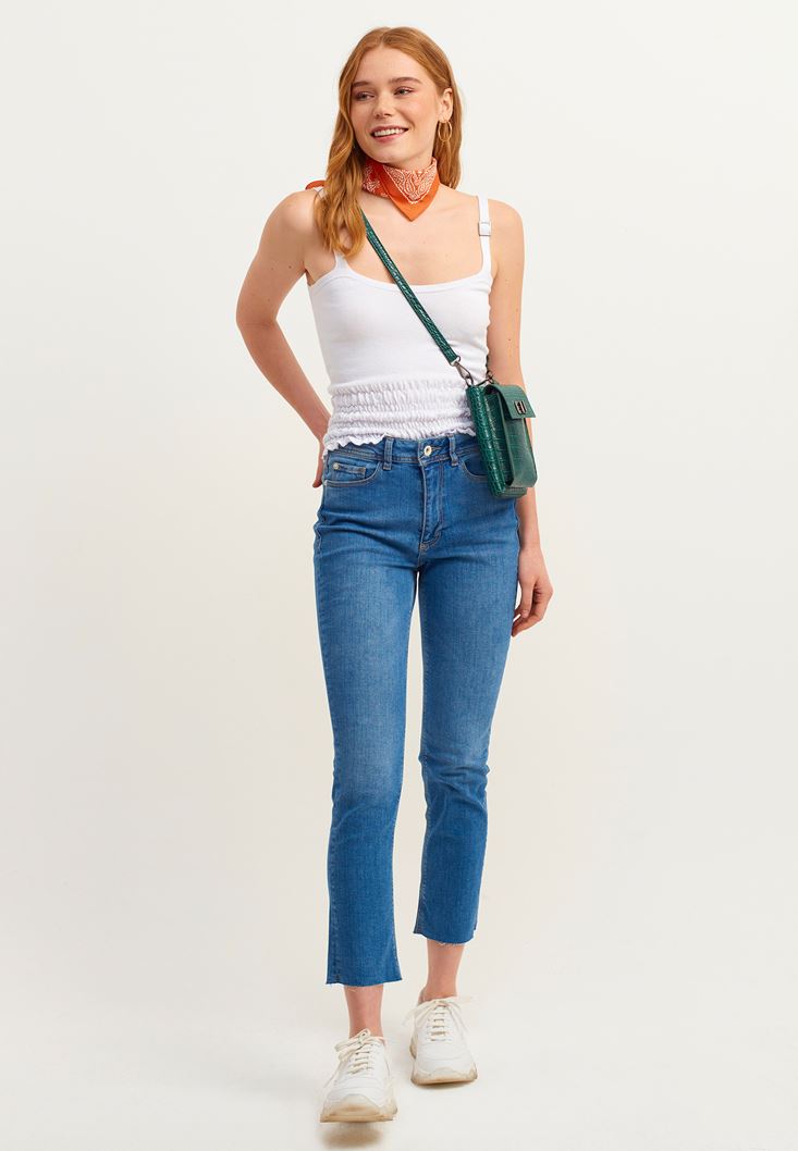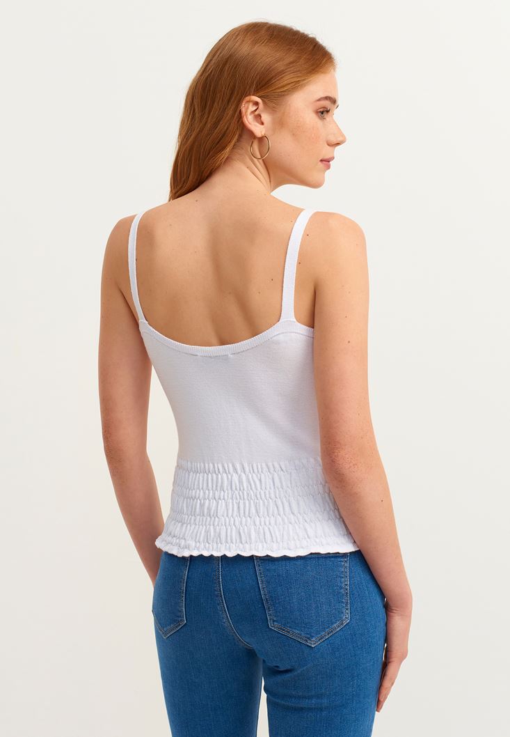 • Bayan Beyaz Toka ve Gipe Detaylı Crop Triko Top