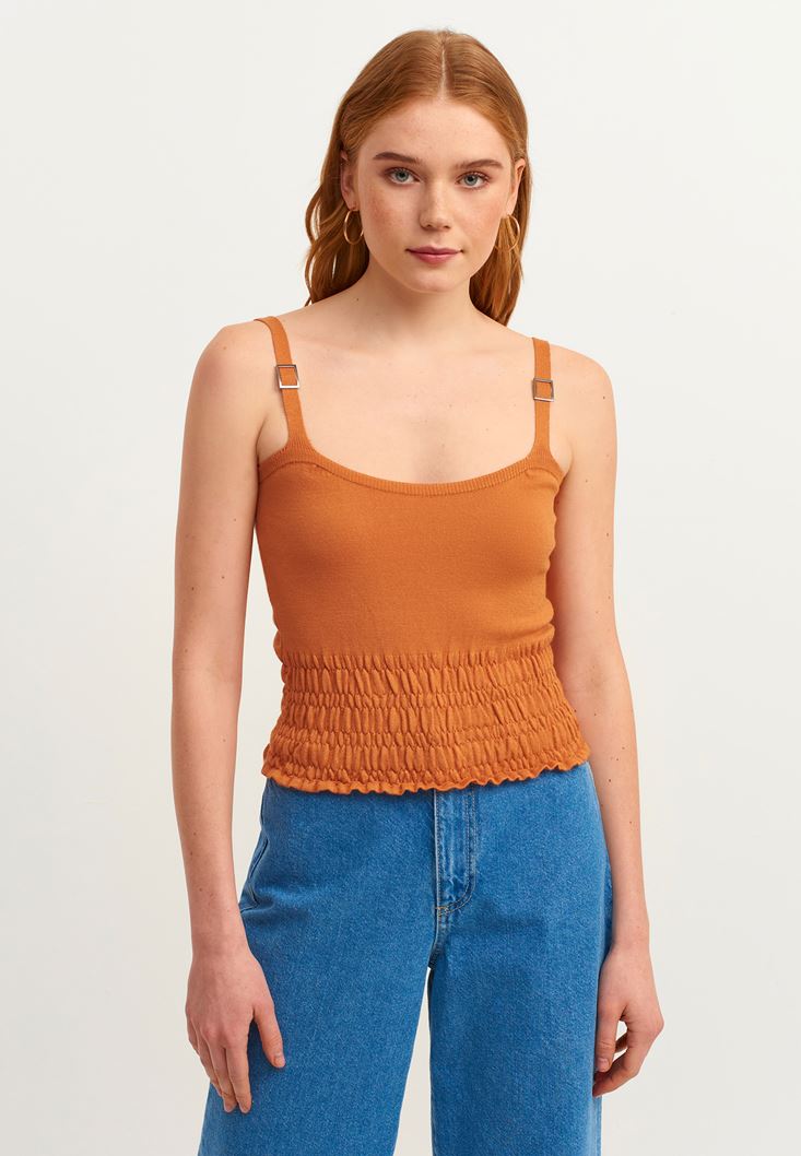 Turuncu Toka ve Gipe Detaylı Crop Triko Top