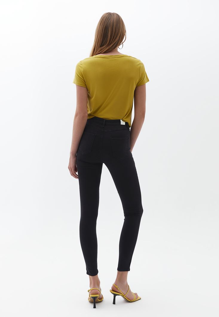 Pamuk ve ( TENCEL™ ) Lyocell karışımlı ekstra yumuşak doku, vücudu ikinci bir ten gibi saran push up etkili skinny fit, bilekte biten paça boyu, geri dönüştürülebilir kumaş, gün boyu formunu koruyan fit, yüksek bel, dar paça.