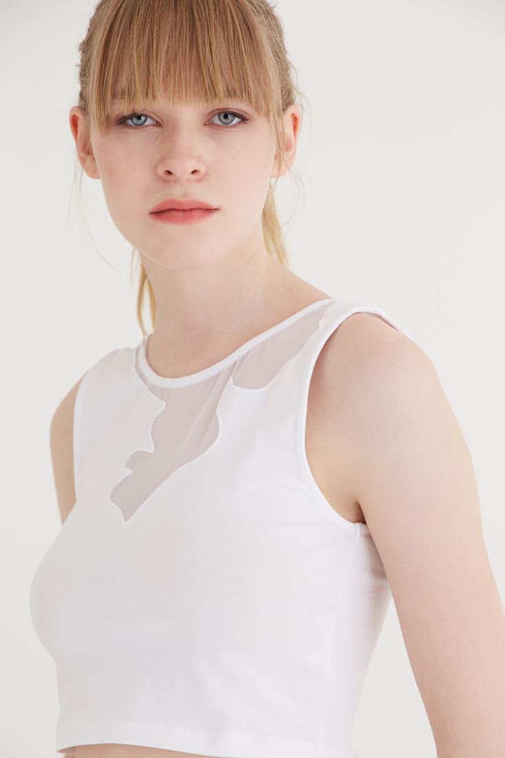 • Bayan Beyaz Tül Detaylı Kısa Üst
