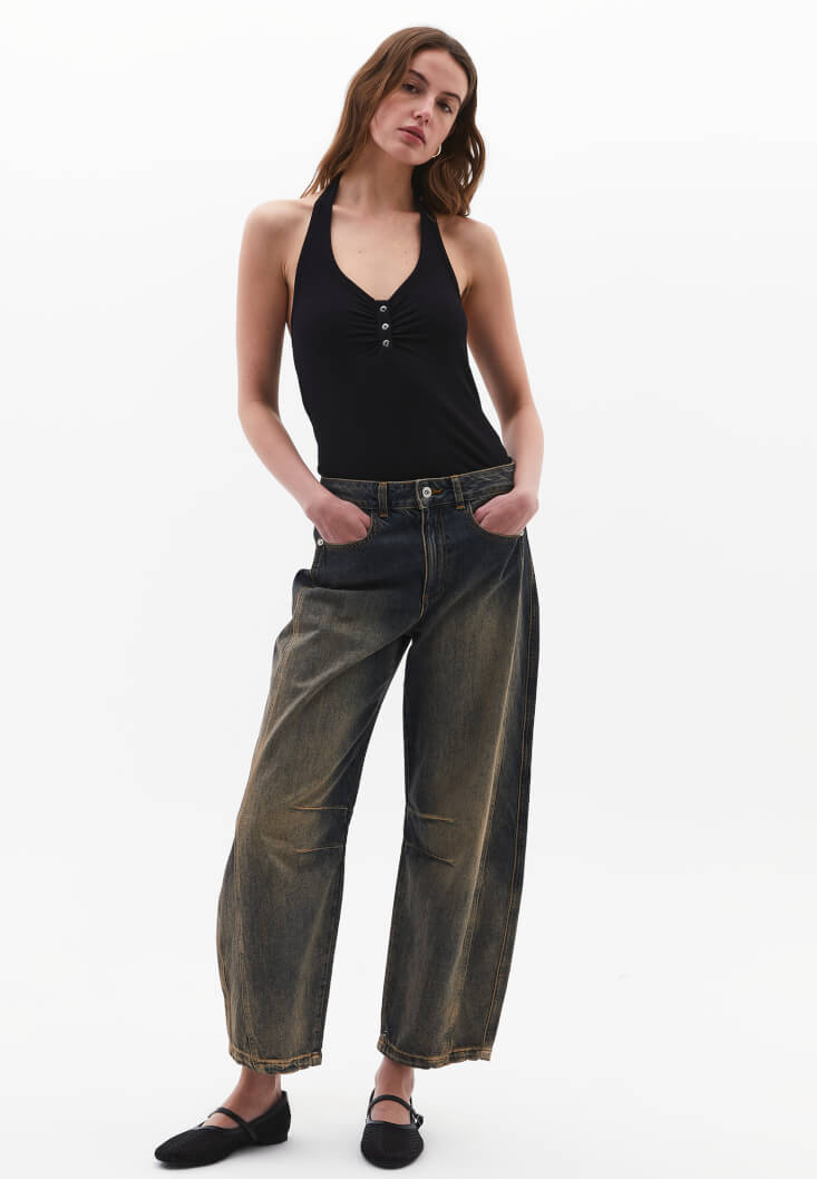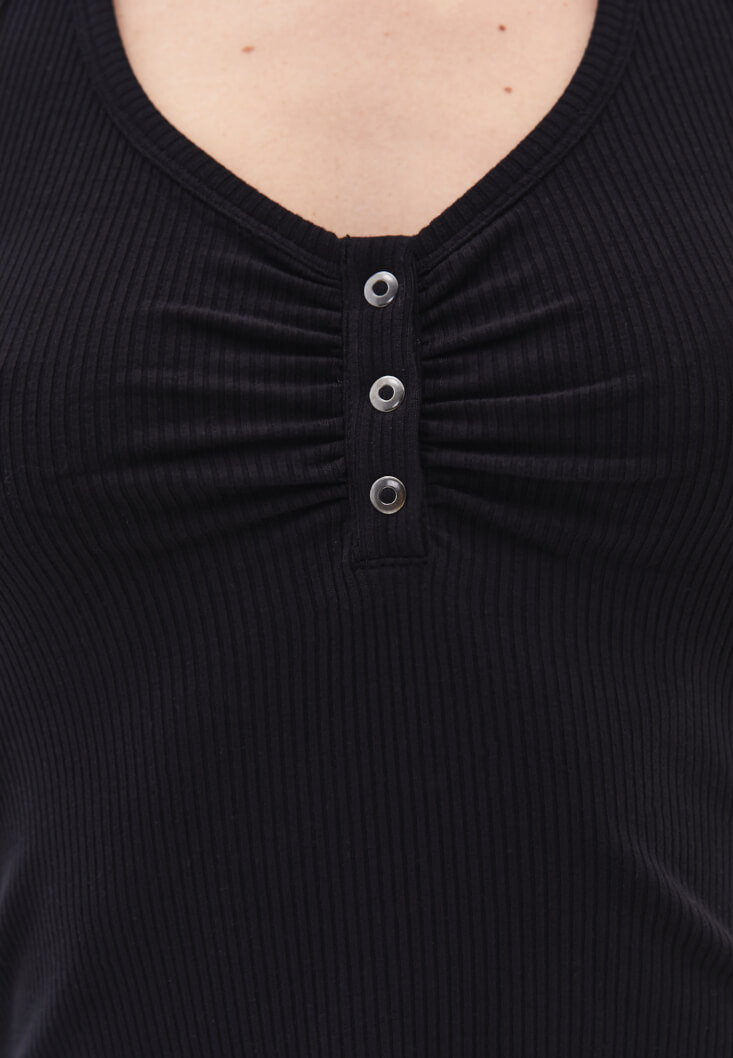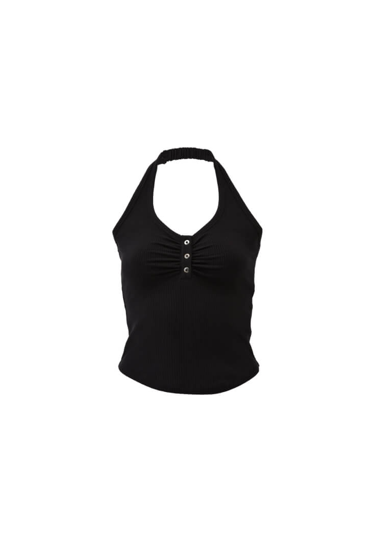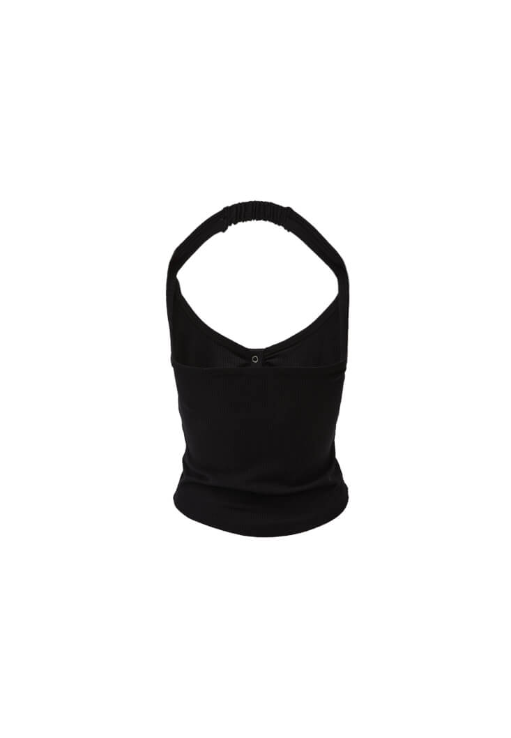 Viskon içerikli jakarlı doku, bedeni saran esnek fit, U yaka, ön kısmı çıtçıt detaylı, boyun kısmından halter yaka form.