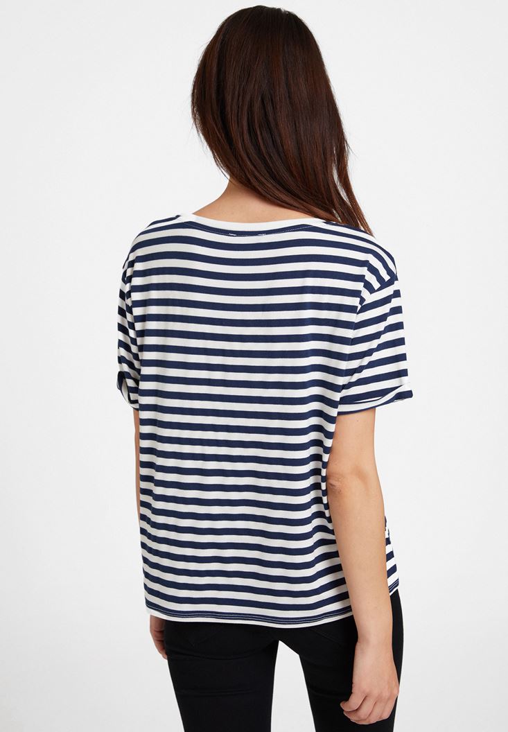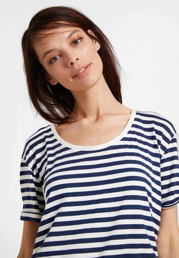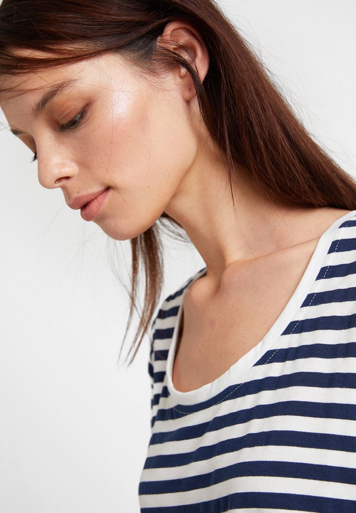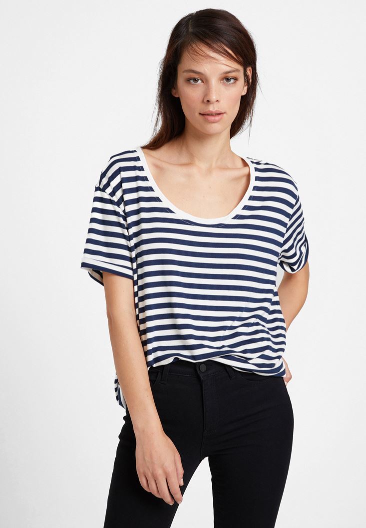 Lacivert/Beyaz U Yaka Çizgi Desenli Tişört