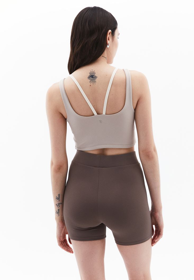 Vücudu saran esnek fit, çift katmanlı tasarım, ince ve kalın askılı, crop kesim, U yaka.