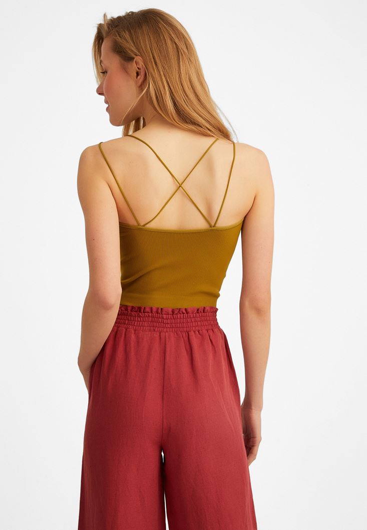 U Yaka Dikişsiz Crop Top modeli hem sadeliği hem de konforu ile kısa sürede kombinlerinizde tercih etmekten vazgeçemeyeceğiniz parçalardan birisi olacak. Tasarımın sahip olduğu U yaka kesimi zarif bir boyun dekoltesini ön plana çıkarırken büstiyer formundaki sırt kesiminde kullanılan çapraz bant detaylar tasarıma hoş bir hava kazandırıyor. İnce askılı tasarım ve çapraz bantlar sırt kesiminde pencere formunda dekolteler oluşturarak crop top modelinin hareketli bir görünüm kazanmasına katkı sağlıyor. Bel kesimi sayesinde farklı bel boylarına sahip olan alt giyim parçaları ile birlikte rahatlıkla kombinlenebilen bu parça OXXO’nun konforu ve şıklığı sade bir şekilde ön plana çıkardığı çok özel tasarımlar arasında dikkat çekiyor.