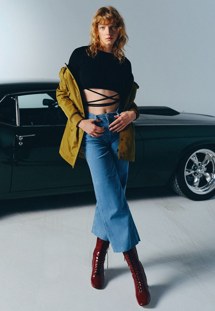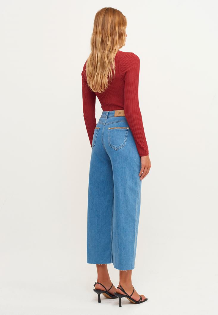 Pamuklu denim doku, ultra yüksek bel, geniş paça, culotte-fit, paça ucu kesik detaylı, bilek üstünde biten paça boyu.