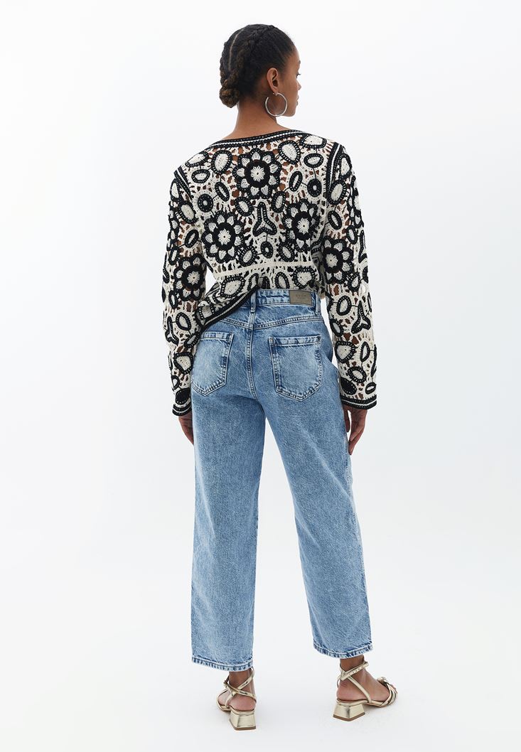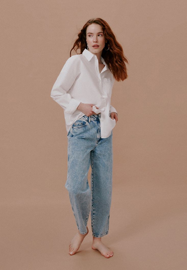 %100 pamuk içerikli denim, ultra yüksek bel, bedenden uzak balon fit, havuç paça, önü ve arkası iki cepli.