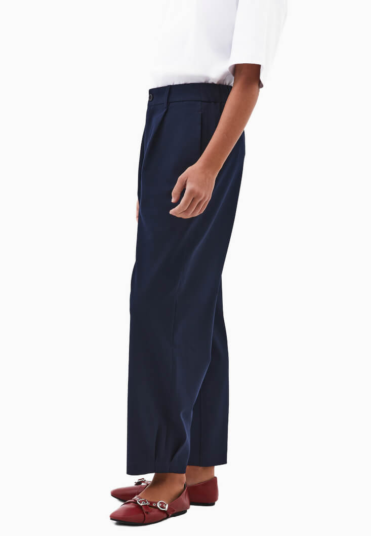 Viskon karışımlı özel doku, ultra yüksek bel, bedenden uzak balon fit, ön bel kısmı pile detaylı, havuç kesim paça, iki cepli, arka bel kısmı lastikli.
